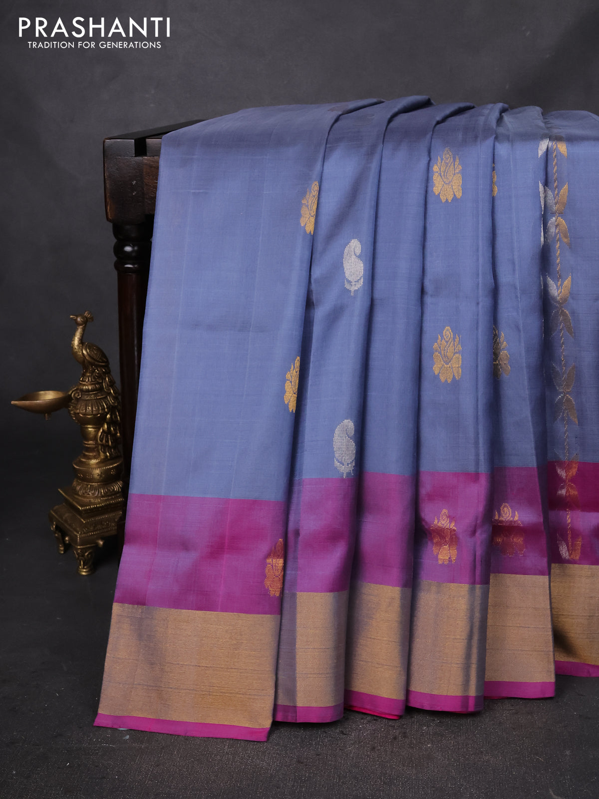 Pure uppada silk saree grey shade and pink with allover silver & gold zari weaves and zari woven border