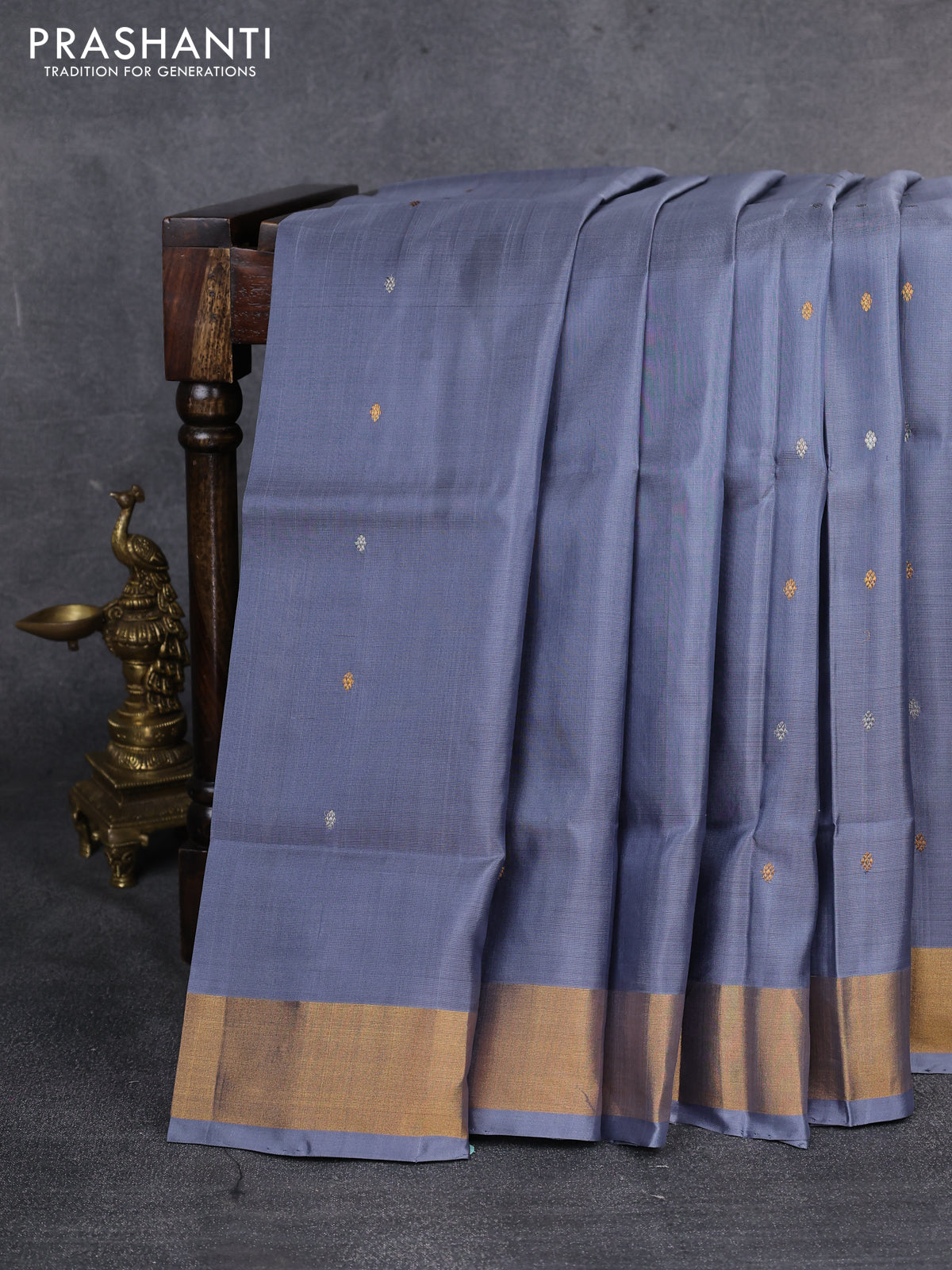 Pure uppada silk saree grey with silver & gold zari woven buttas and zari woven border