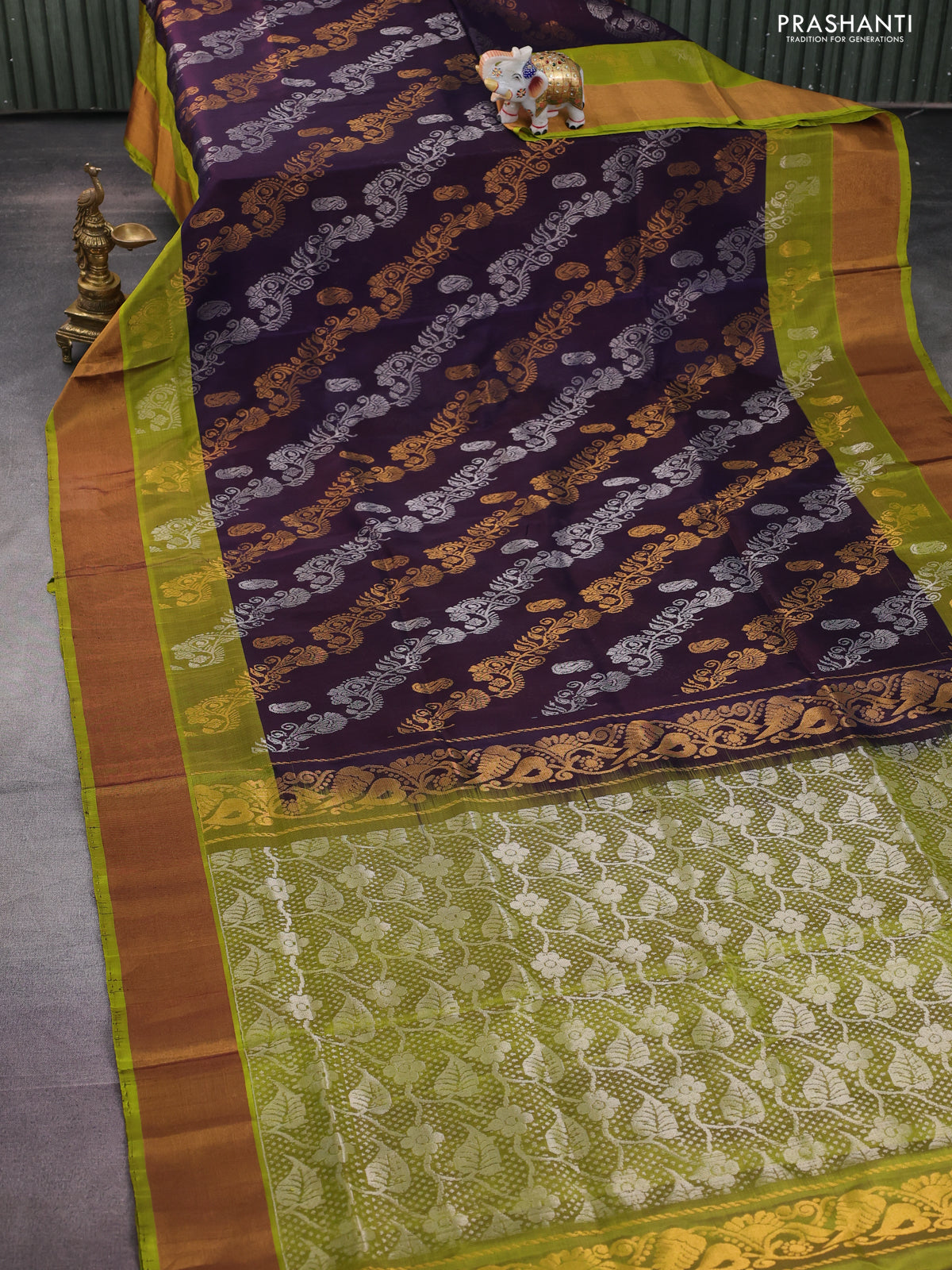 Pure uppada silk saree jamun shade and light green with allover silver & gold zari weaves and zari woven border