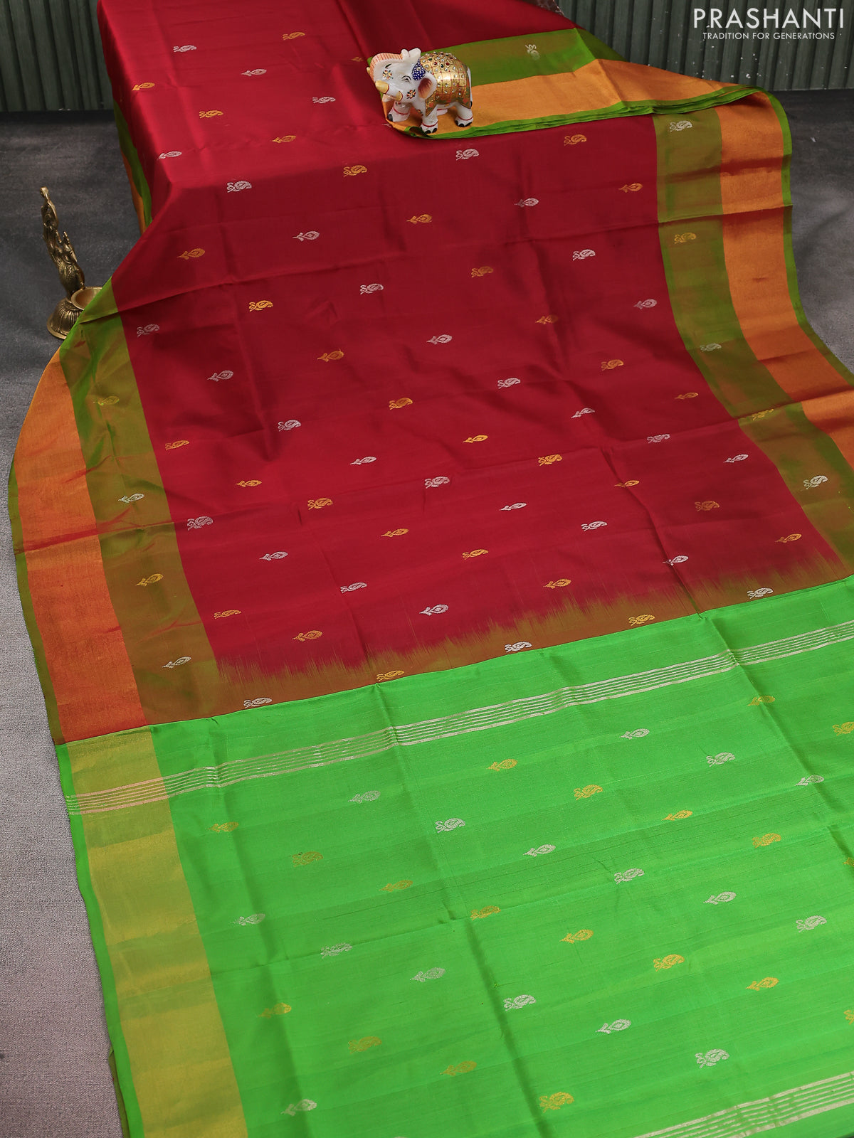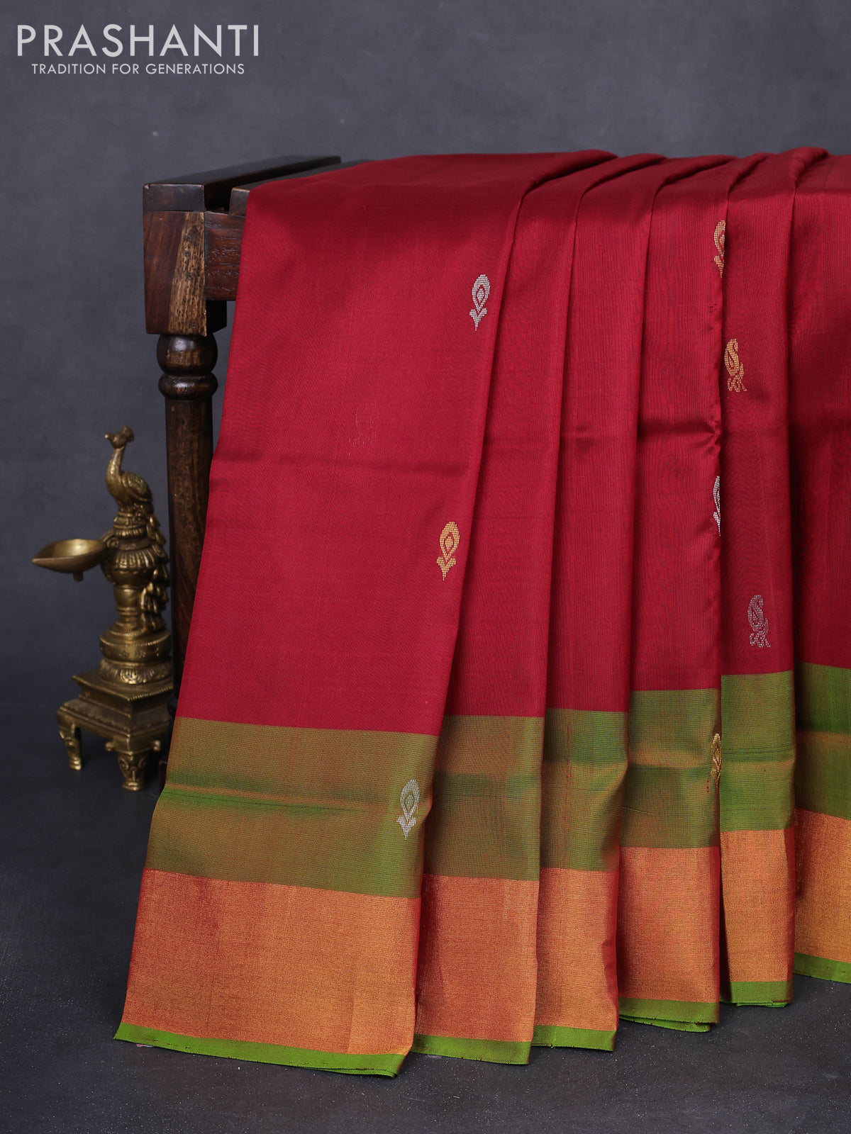Pure uppada silk saree maroon and green with silver & gold zari woven buttas and zari woven border