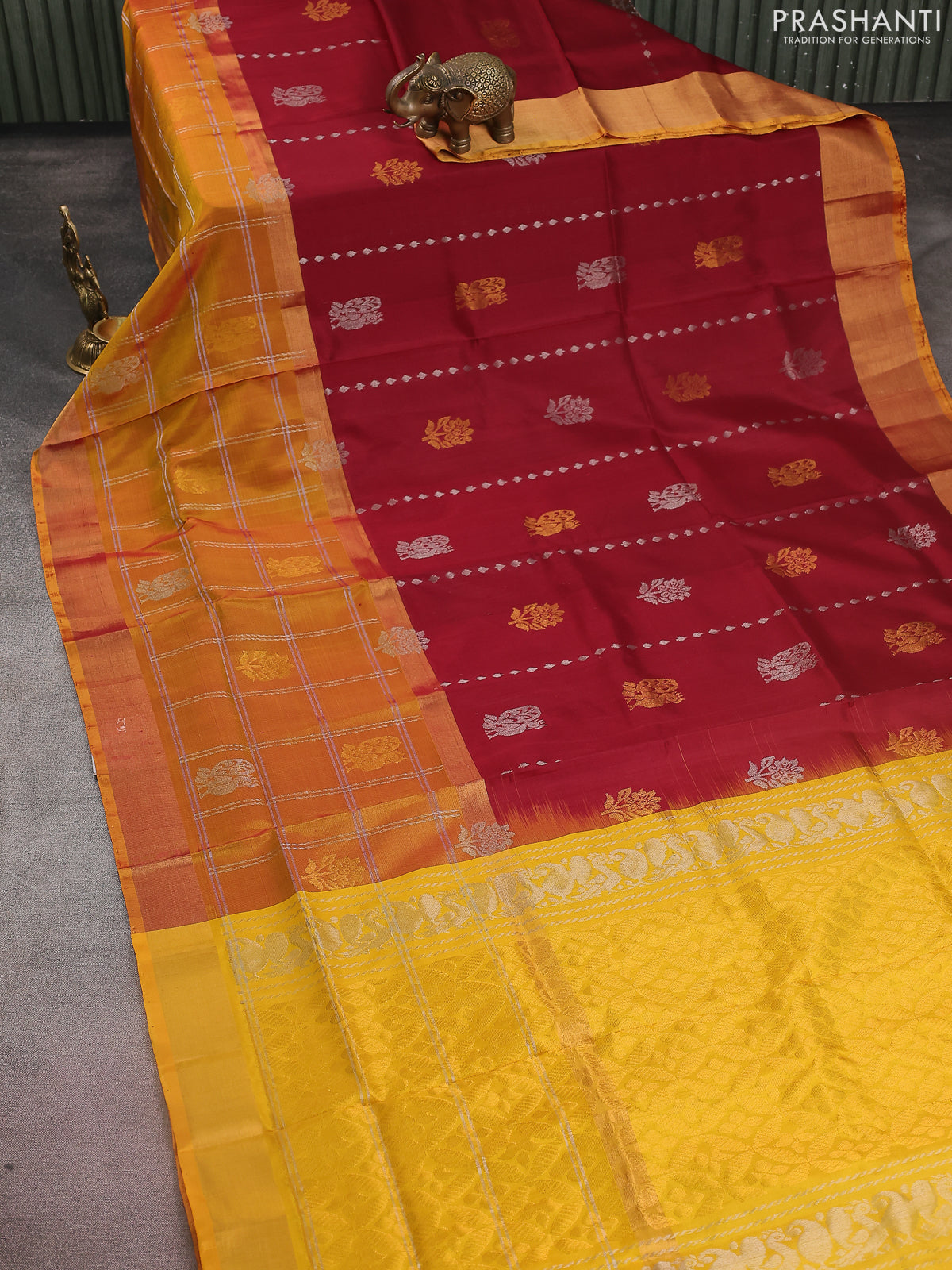Pure uppada silk saree maroon and yellow with silver & gold zari weaves & buttas and long zari checked border