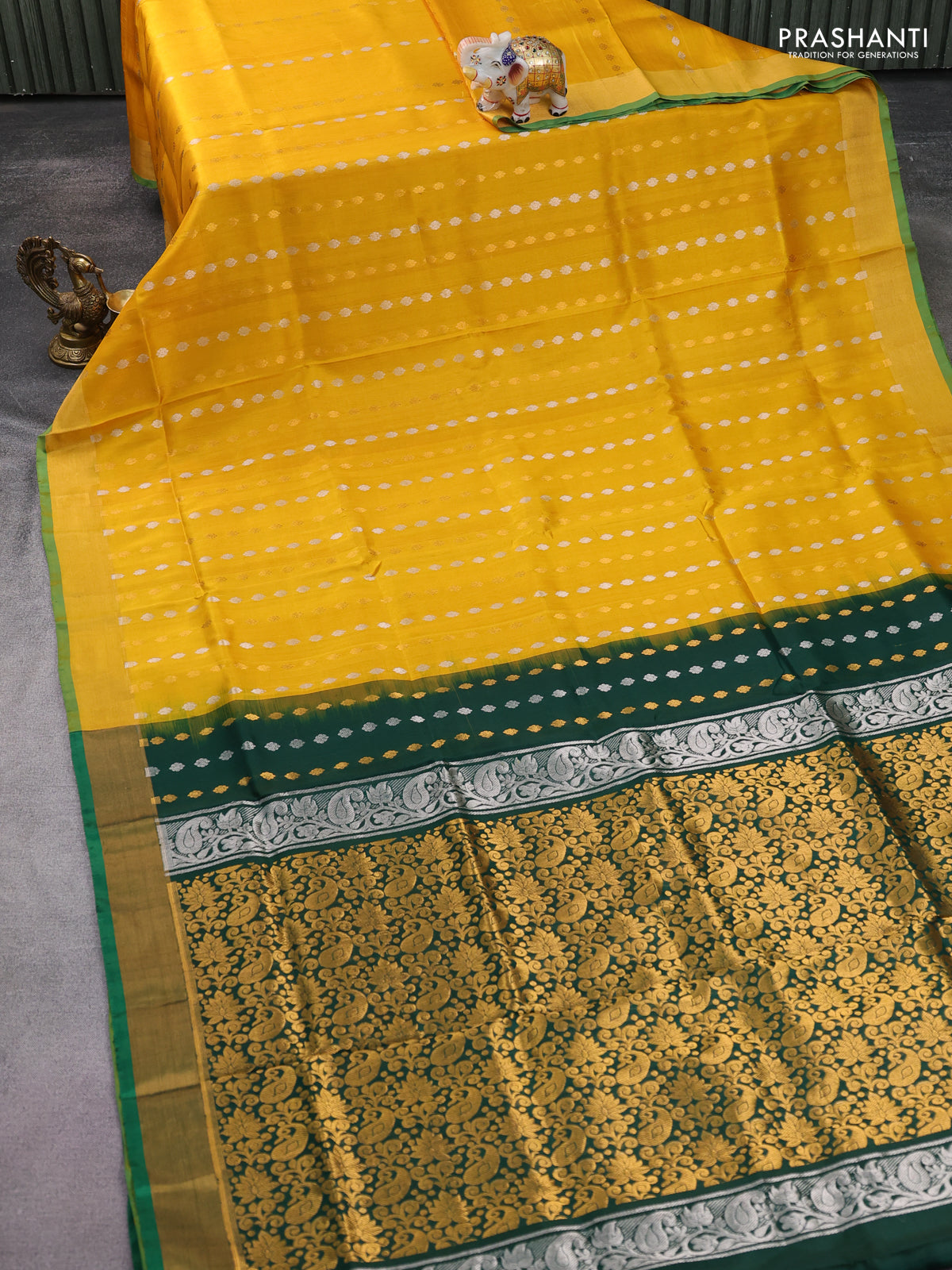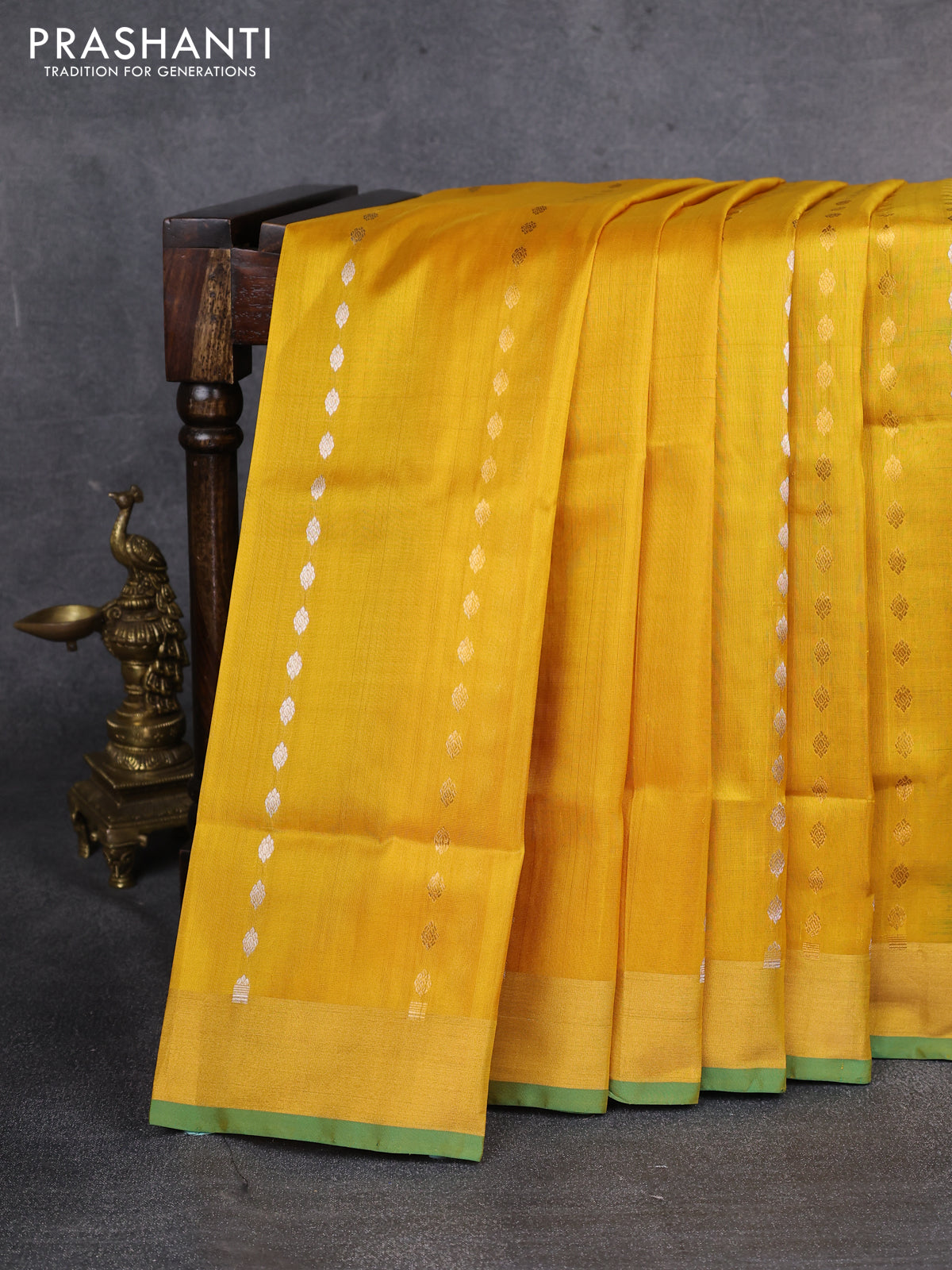 Pure uppada silk saree mustard yellow and green with allover silver & gold zari weaves and zari woven border