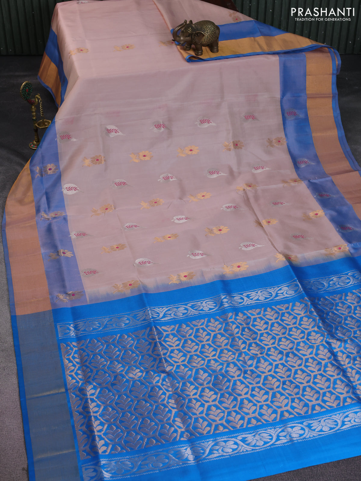 Pure uppada silk saree pastel peach and cs blue with silver & gold zari woven buttas and zari woven border
