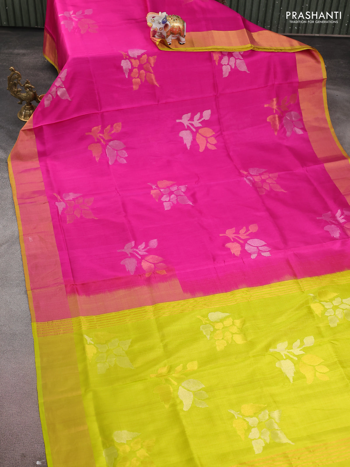 Pure uppada silk saree pink and lime yellow with jamdhani buttas and jamdhani design pallu