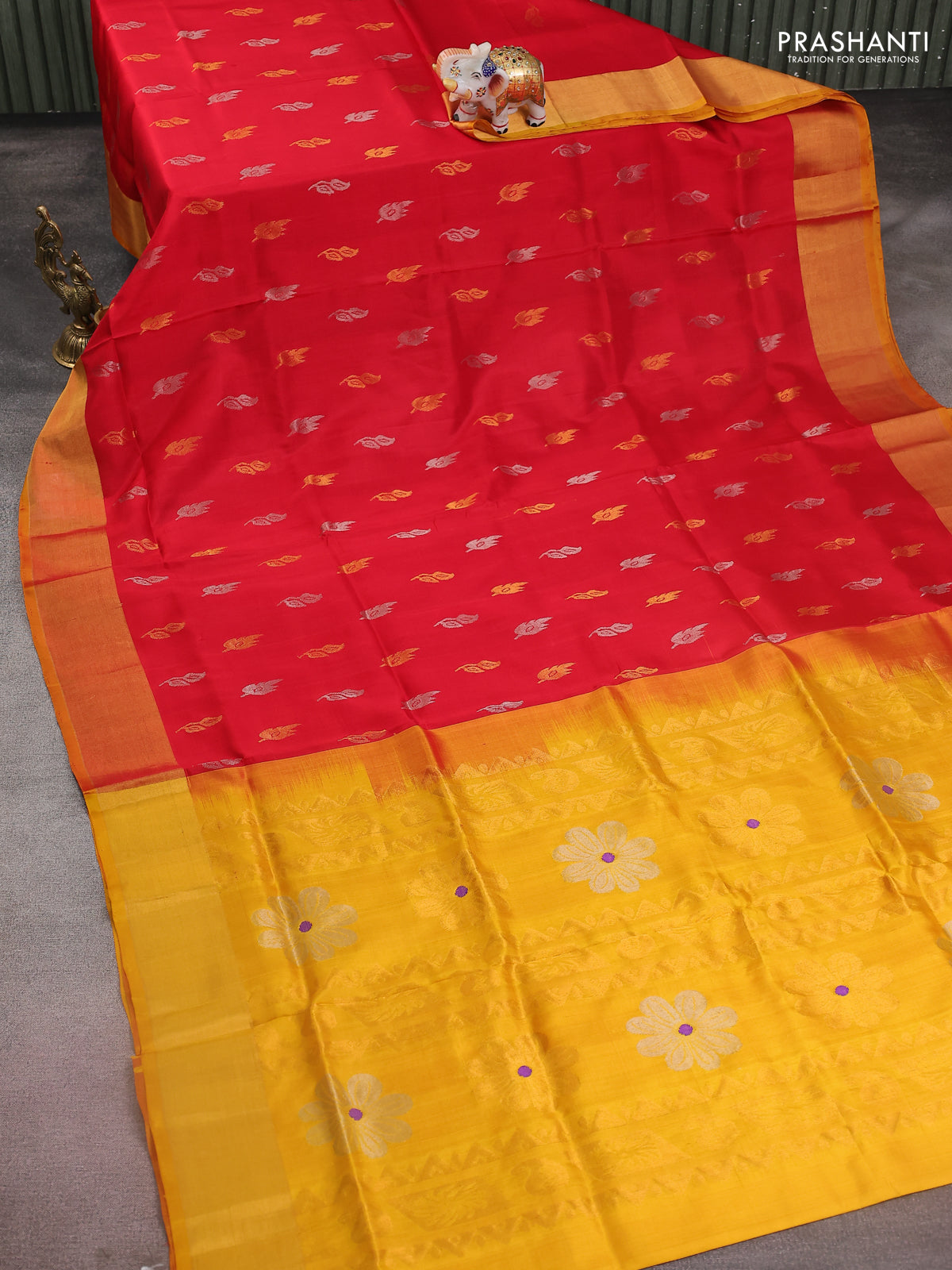 Pure uppada silk saree red and mustard yellow with silver & gold zari woven buttas and zari woven border