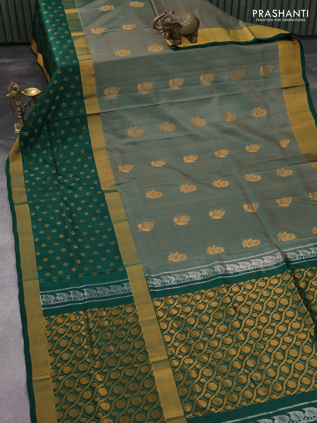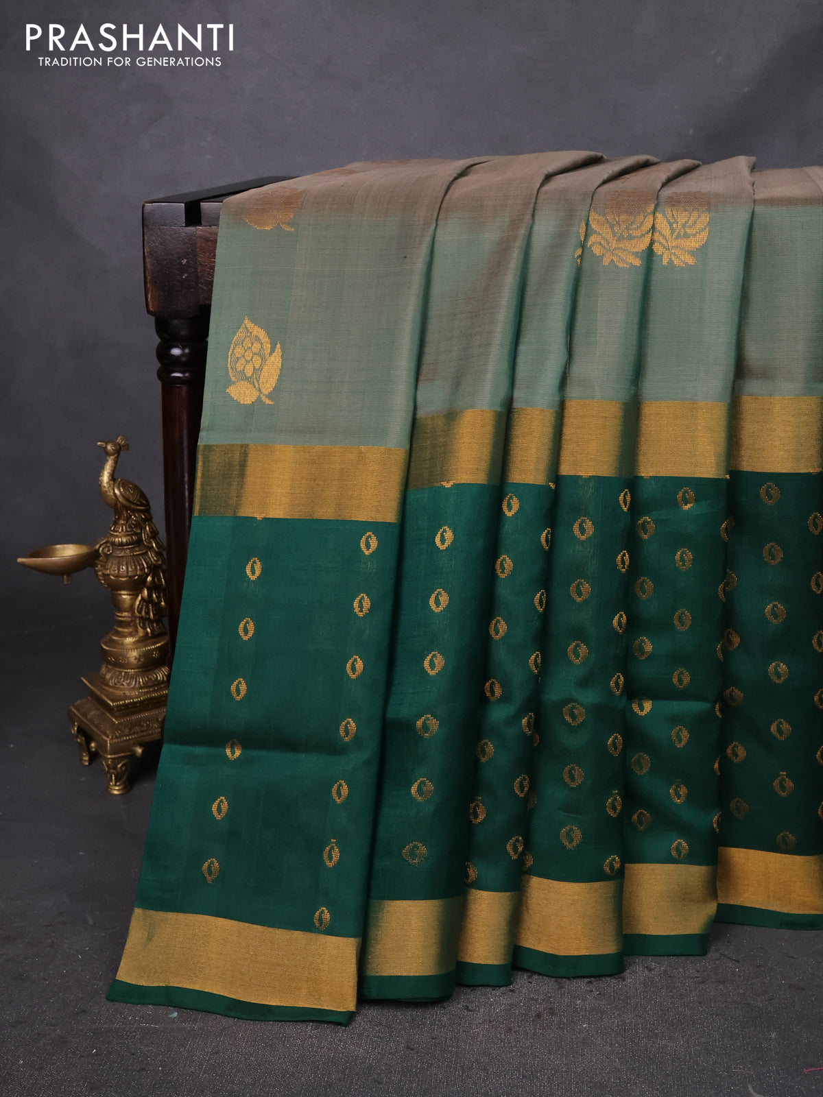 Pure uppada silk saree sap green and dark green with zari woven buttas and long zari woven butta border