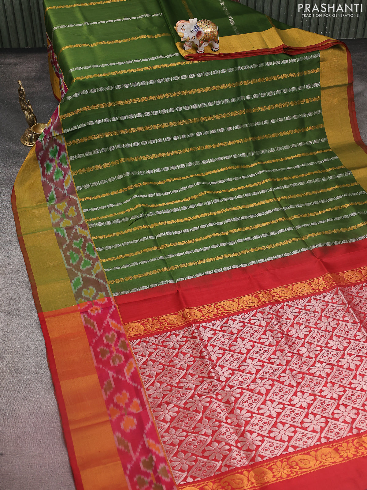 Pure uppada silk saree sap green and red with allover silver & gold zari weaves and zari woven ikat style border