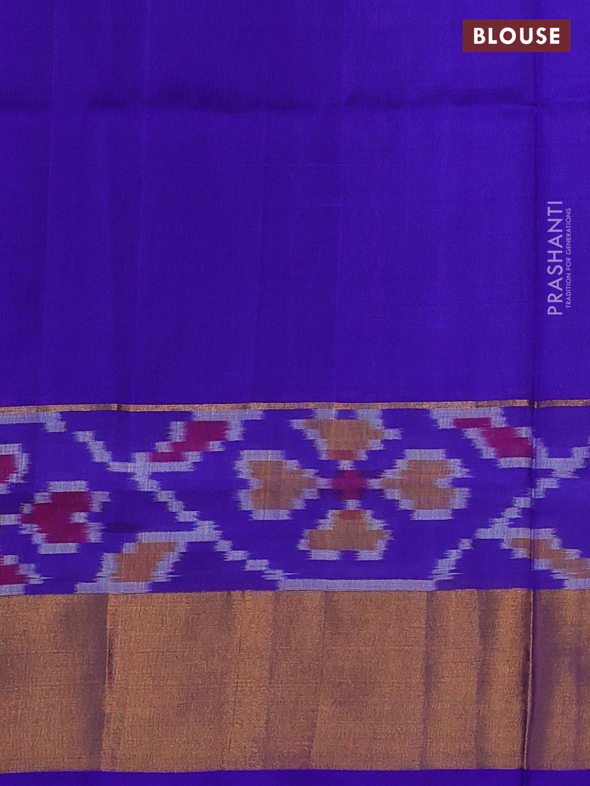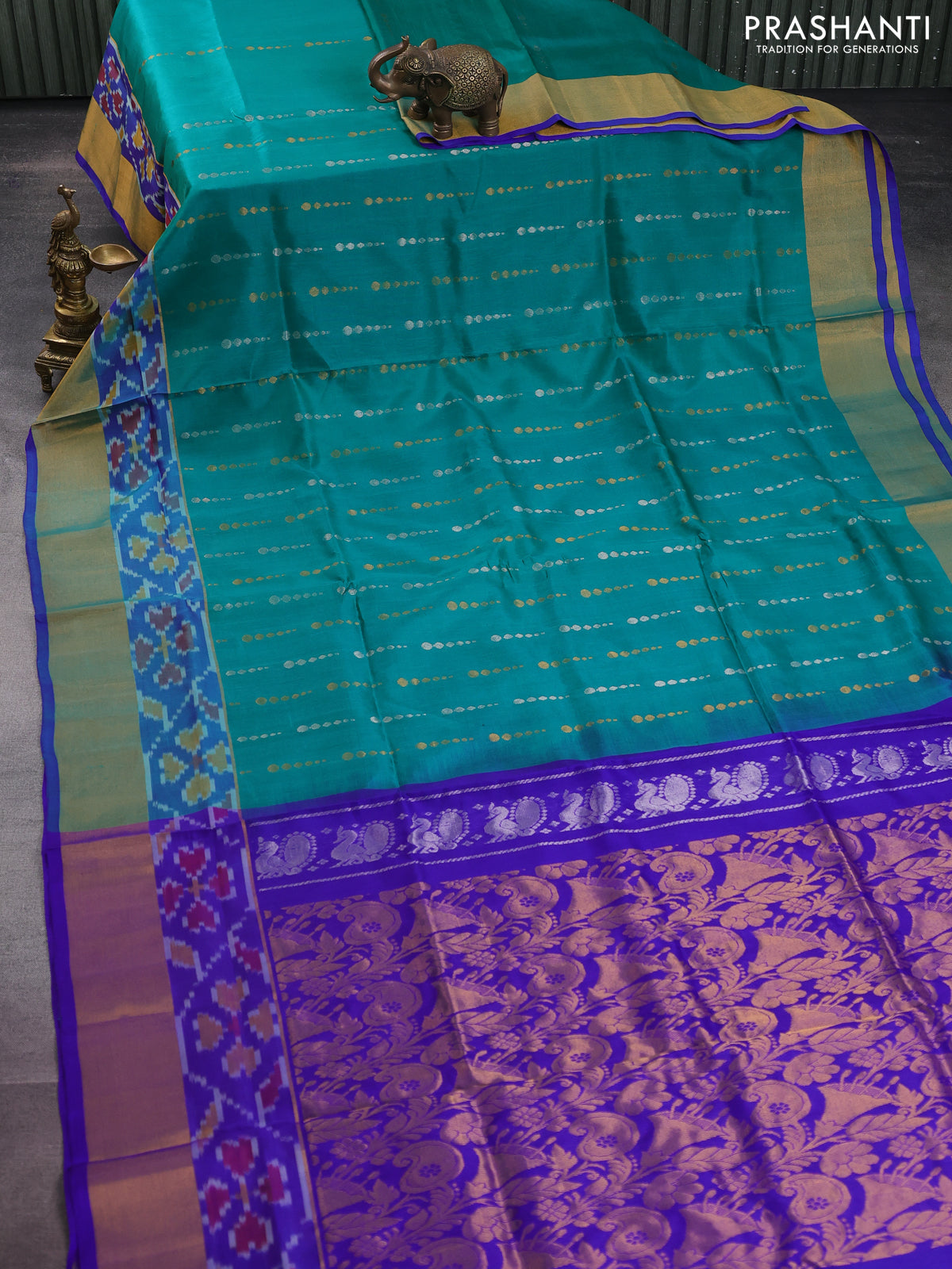 Pure uppada silk saree teal green and blue with silver & gold zari woven geometric buttas and zari woven ikat style border