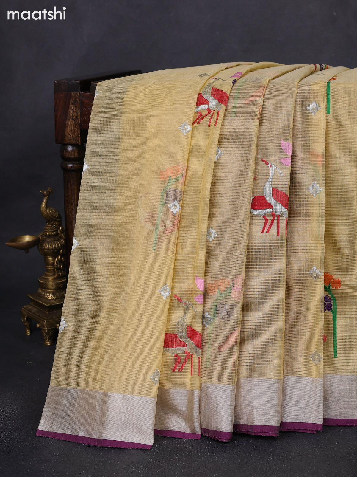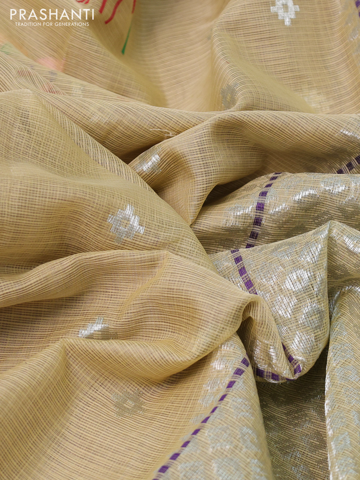 Pure zari kota silk saree beige and purple with silver zari woven buttas and silver zari woven border