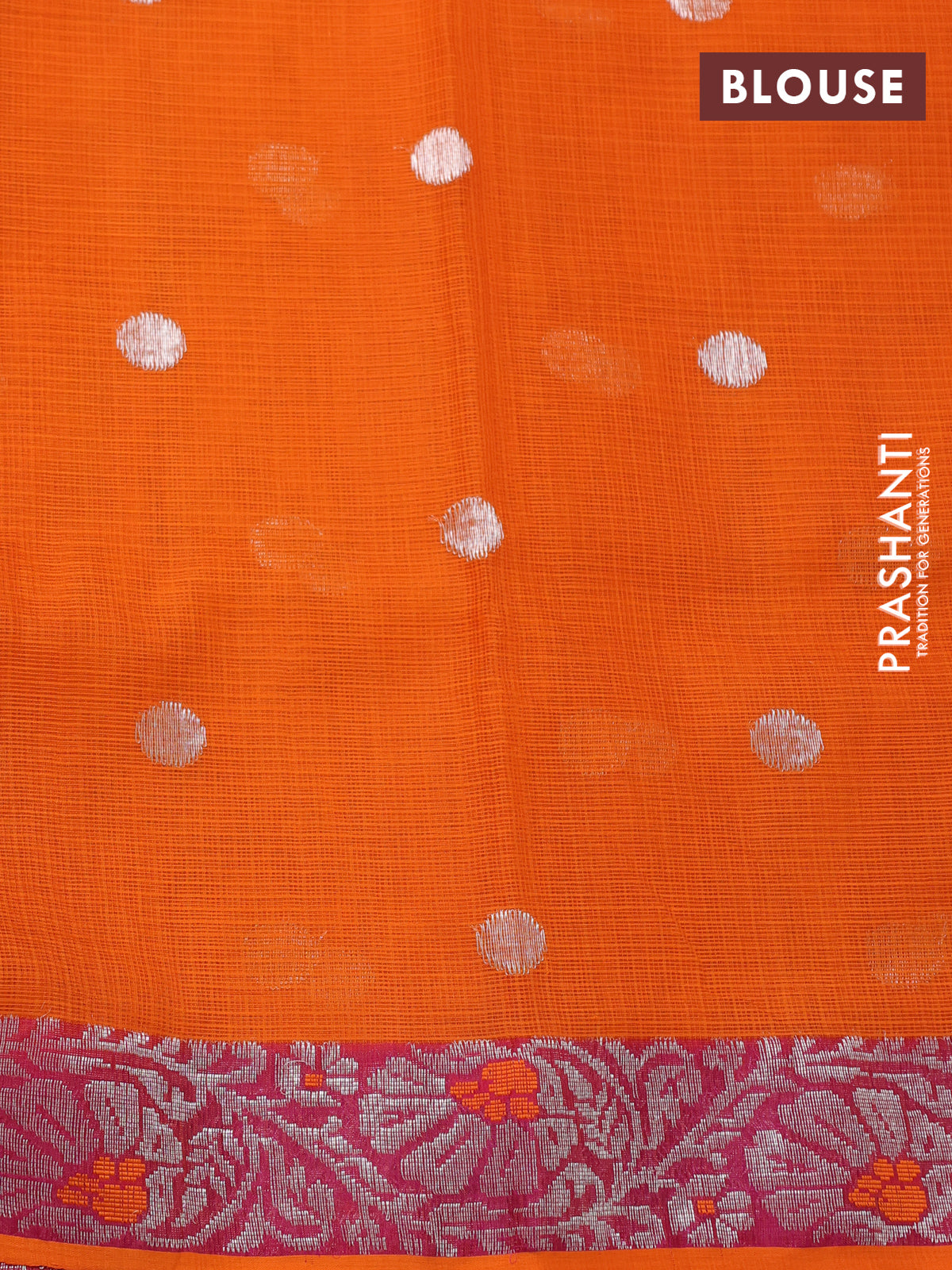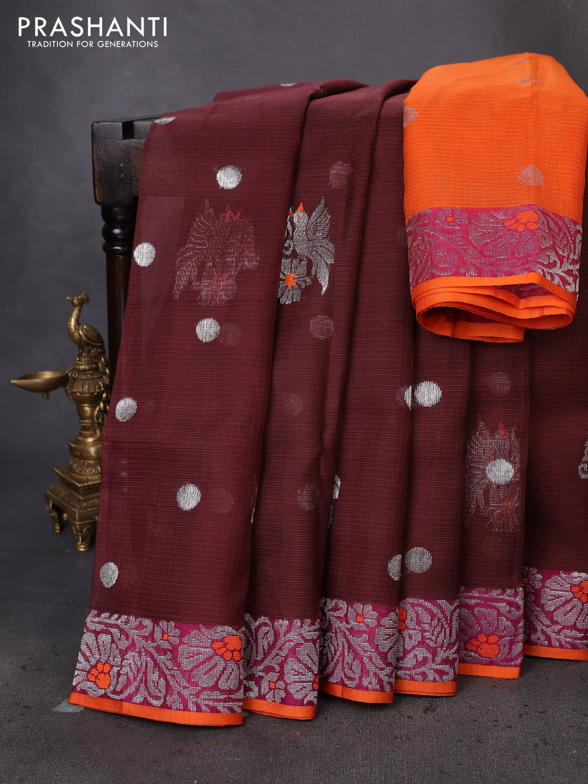 Pure zari kota silk saree brown and orange with silver zari woven buttas and floral design silver zari woven border