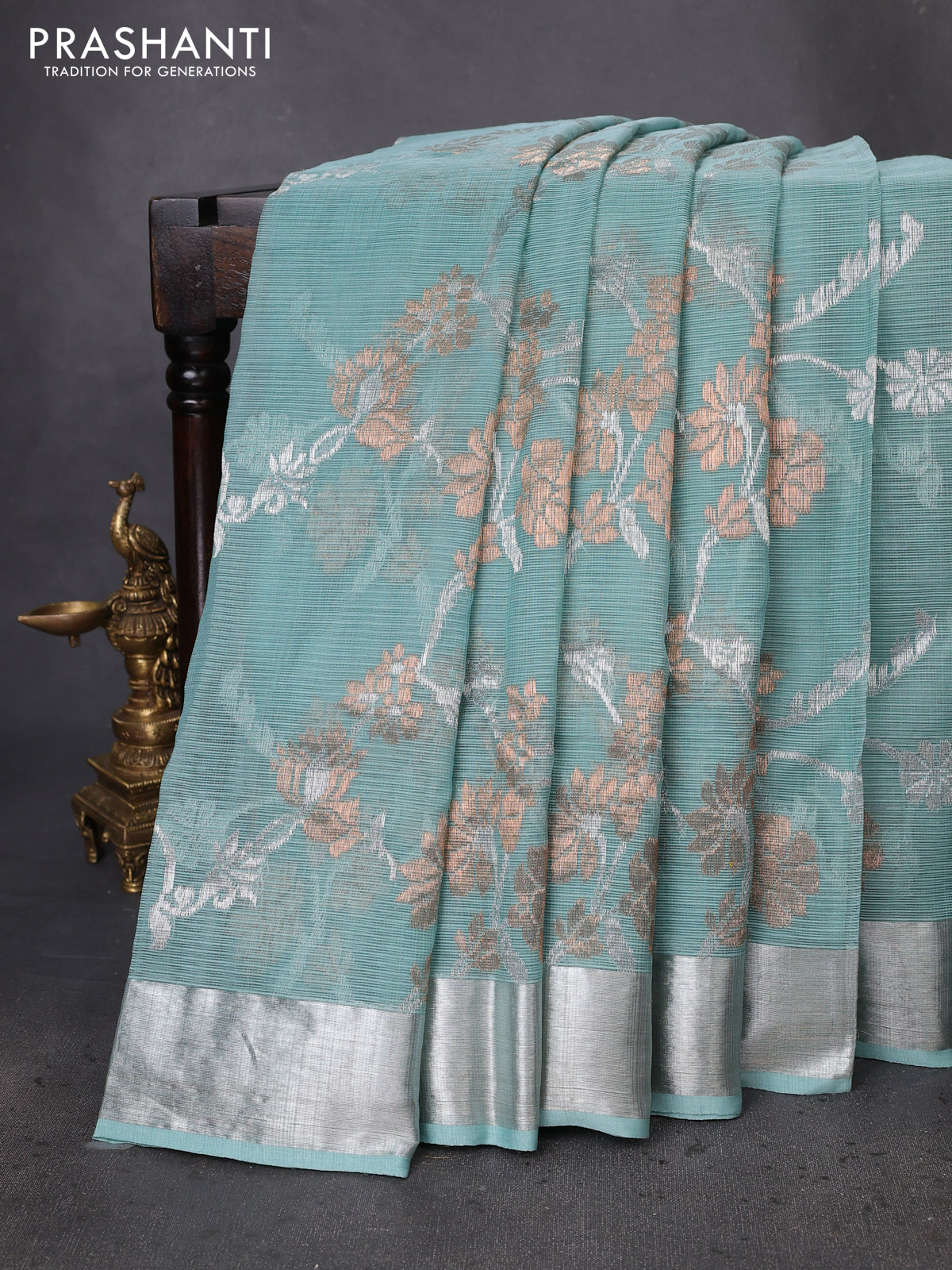 Pure zari kota silk saree pastel blue with allover silver & gold floral weaves and silver zari woven border
