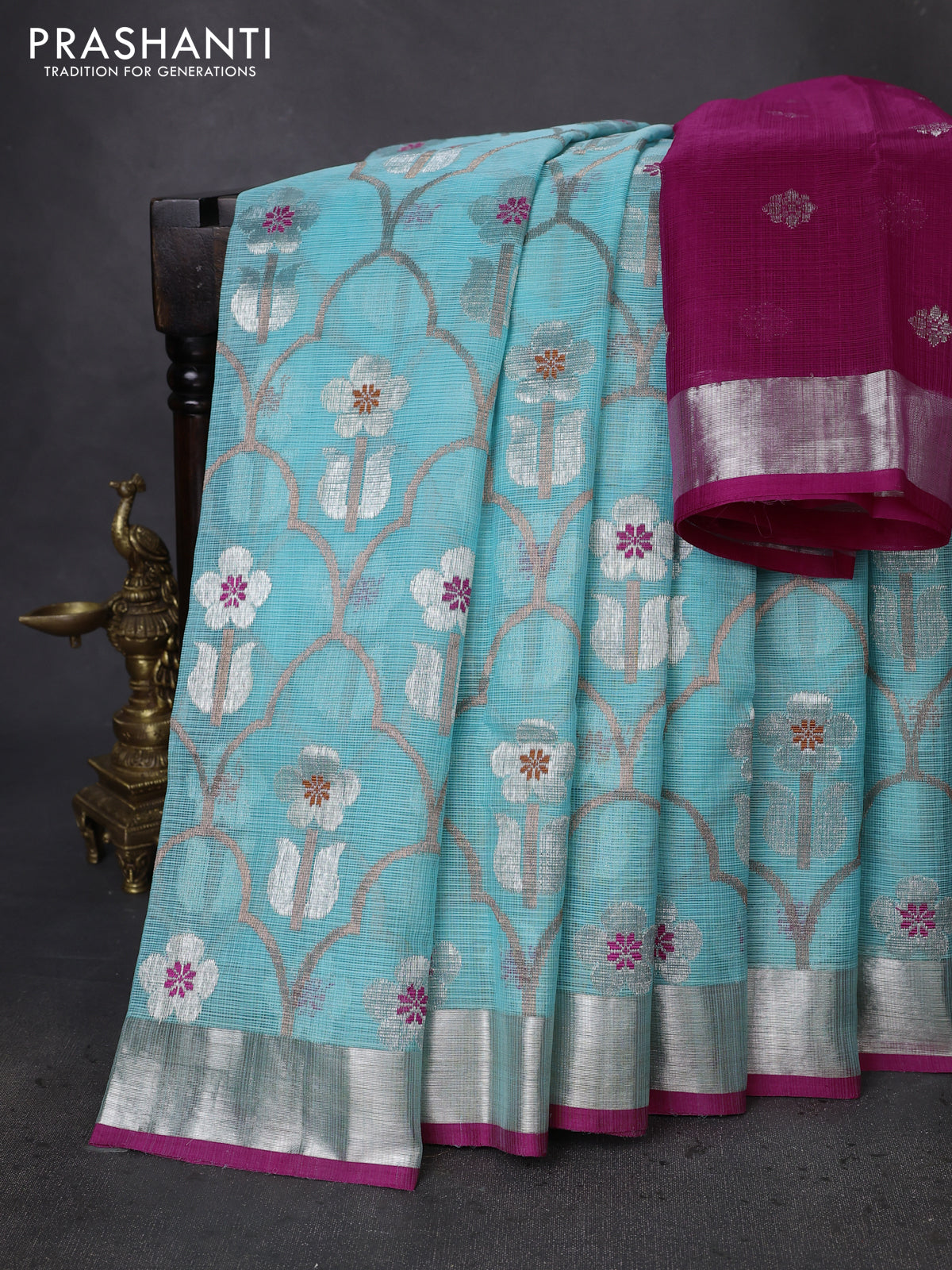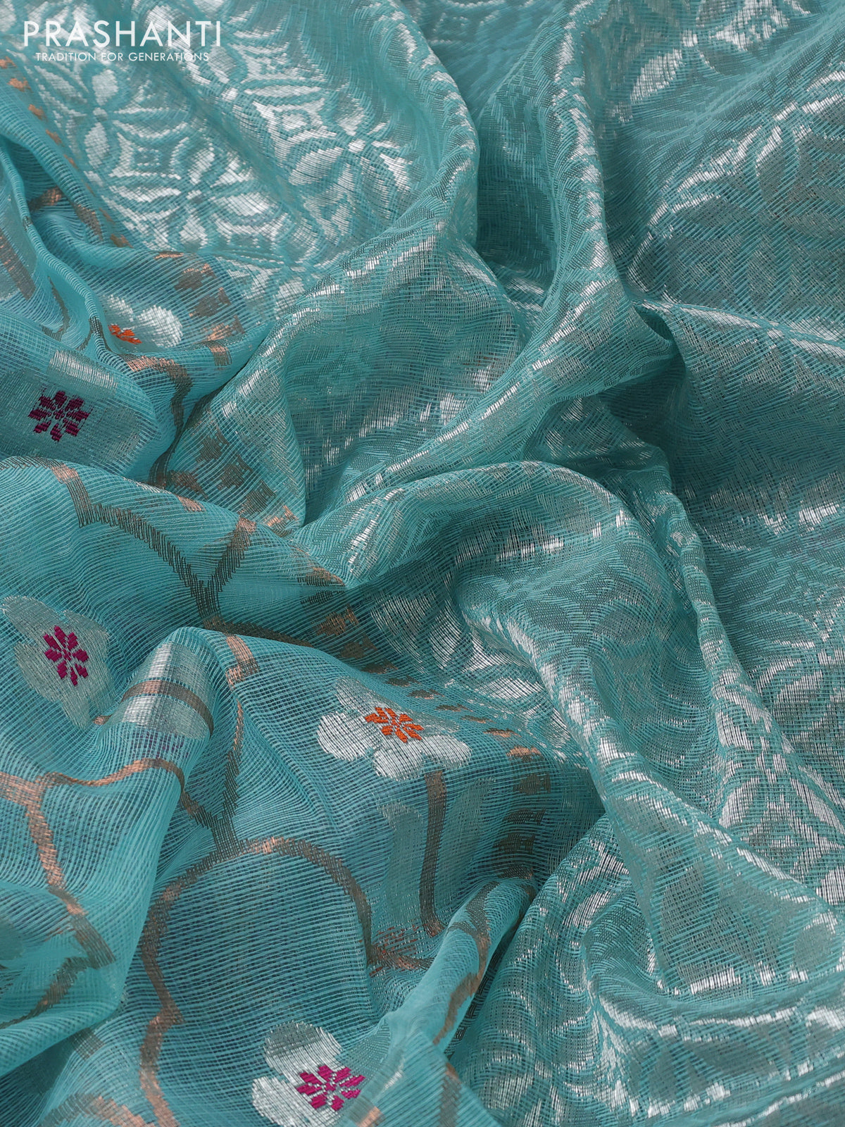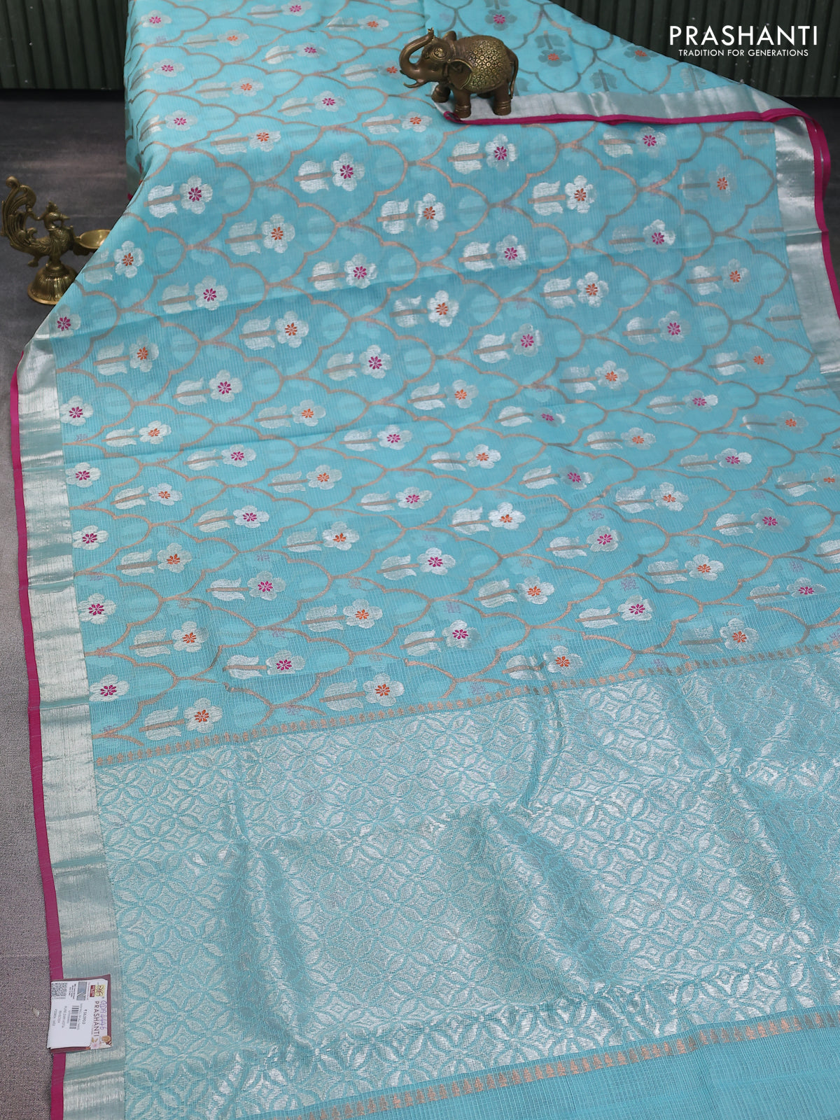 Pure zari kota silk saree teal blue and pink with allover silver & copper zari weaves and silver zari woven border