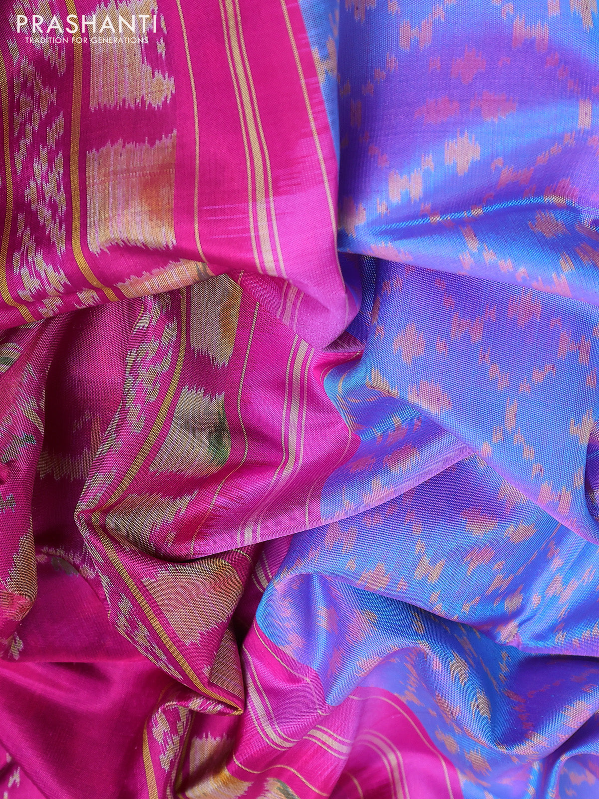 Rajkot patola silk saree dual shade of blue and maganta pink with allover ikat weaves and ikat woven zari border