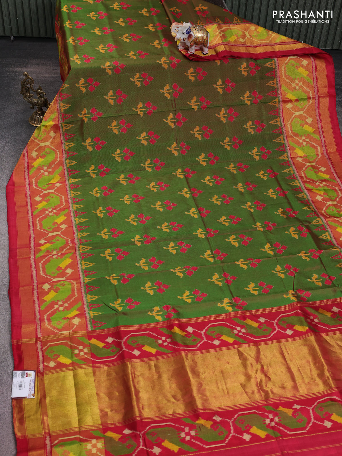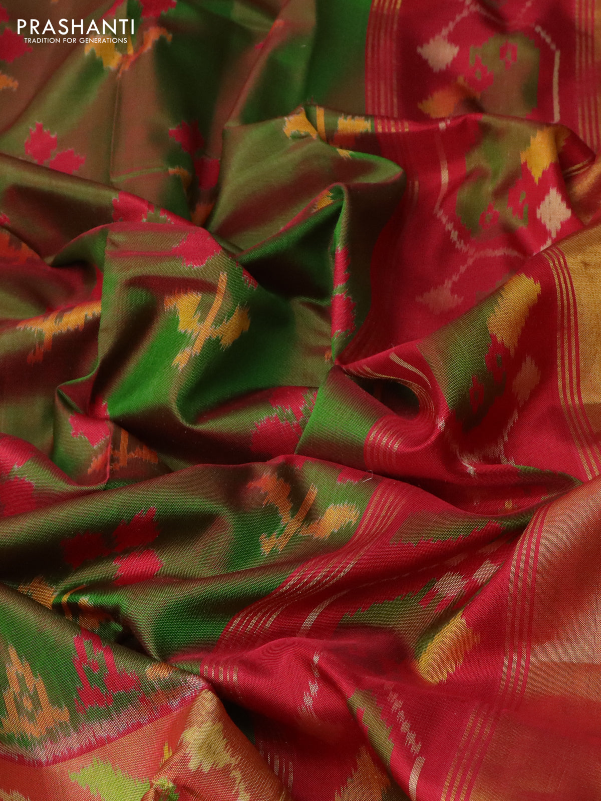 Rajkot patola silk saree dual shade of green and red with allover ikat butta weaves and ikat woven zari border