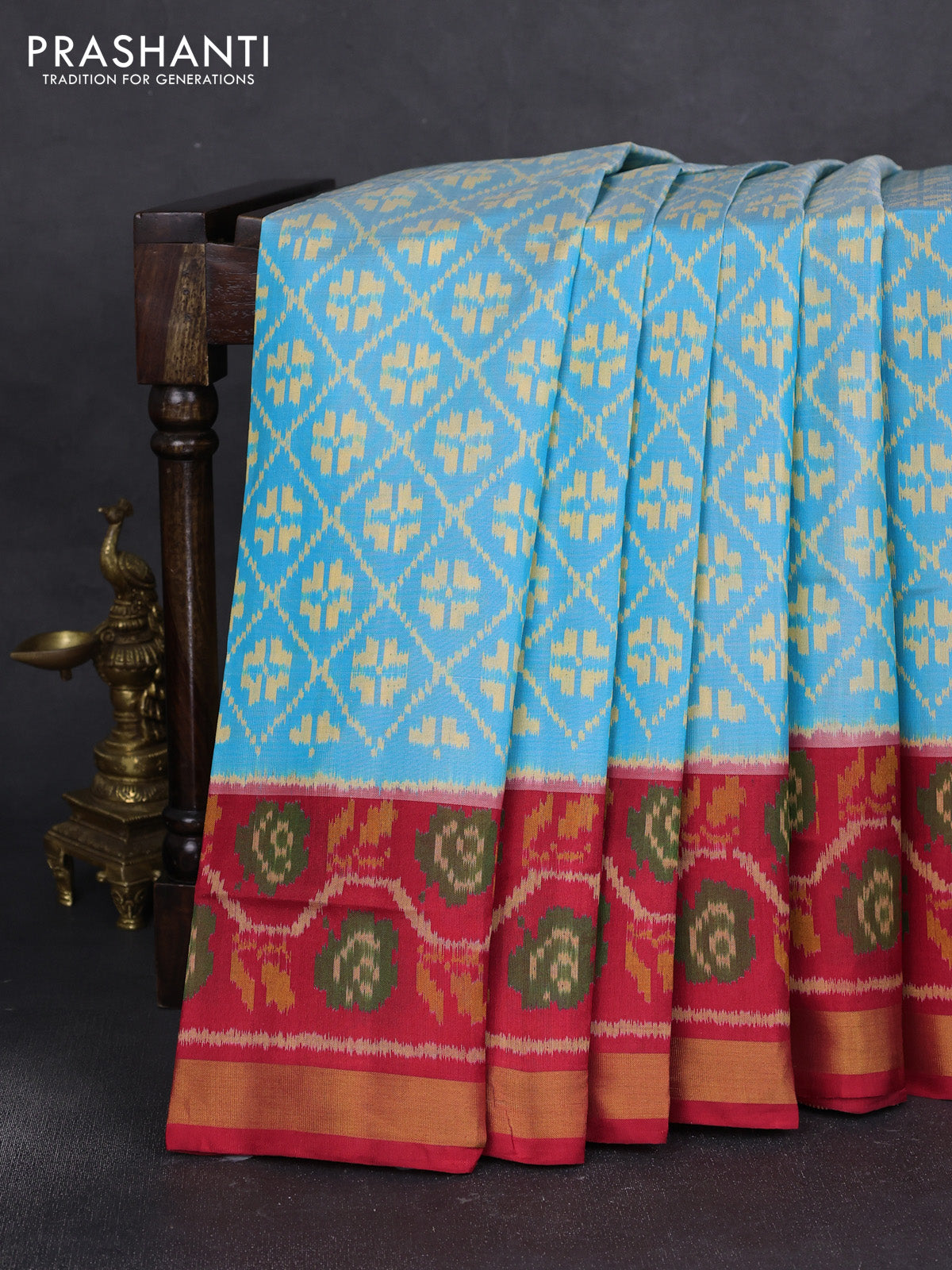 Rajkot patola silk saree light blue and red with allover ikat weaves and ikat woven zari border