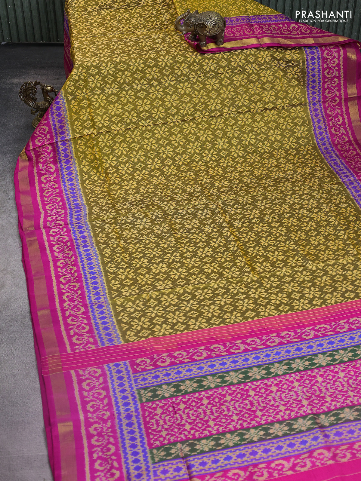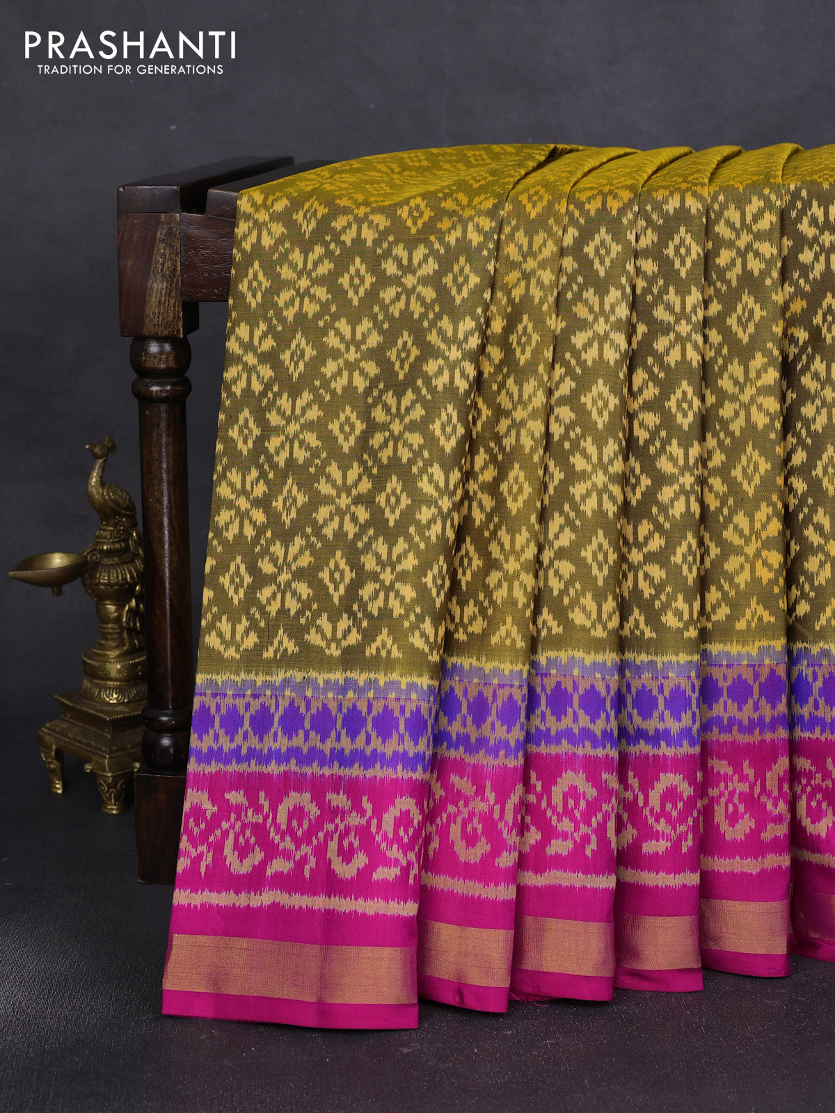 Rajkot patola silk saree mehendi green and pink with allover ikat weaves and ikat woven zari border