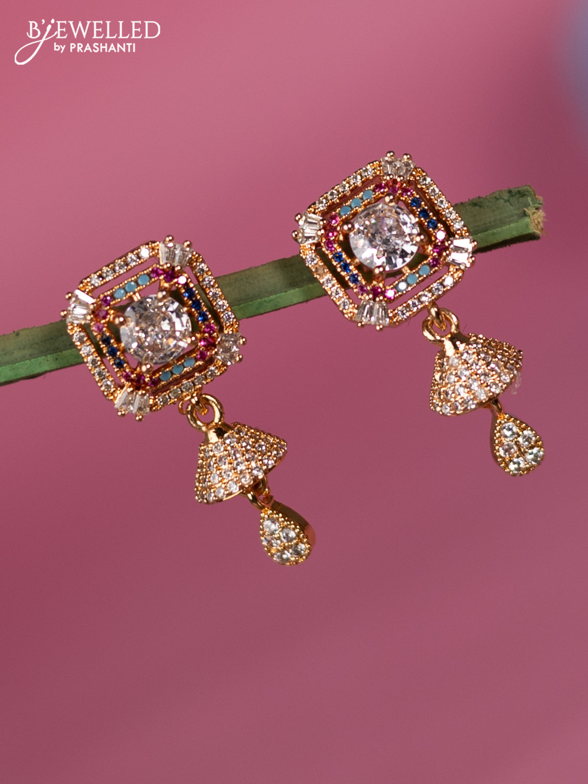 Rose gold earring with multicolour & cz stone and jhumka hanging