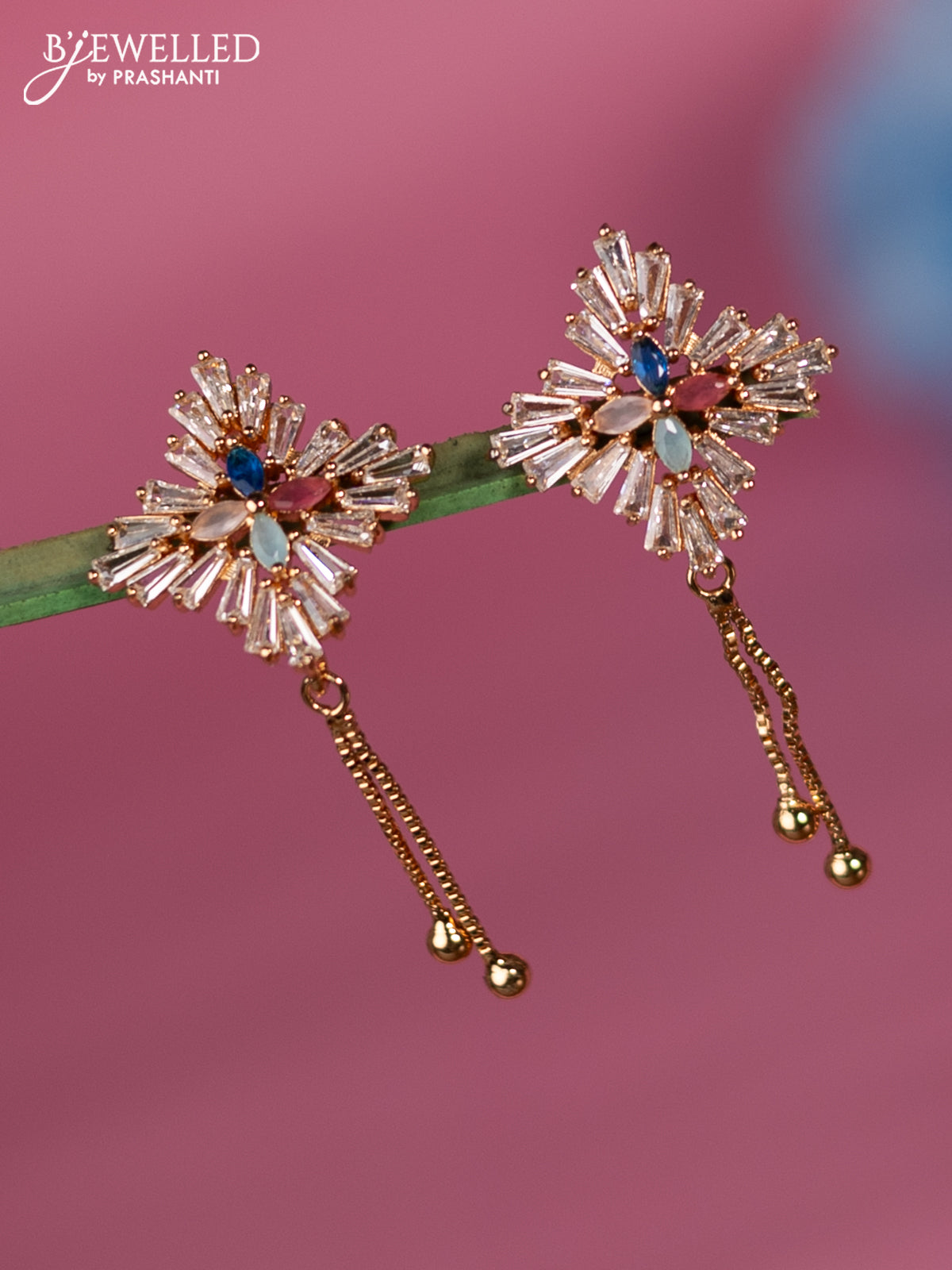 Rose gold earring with multicolur & cz stone and golden beads hanging