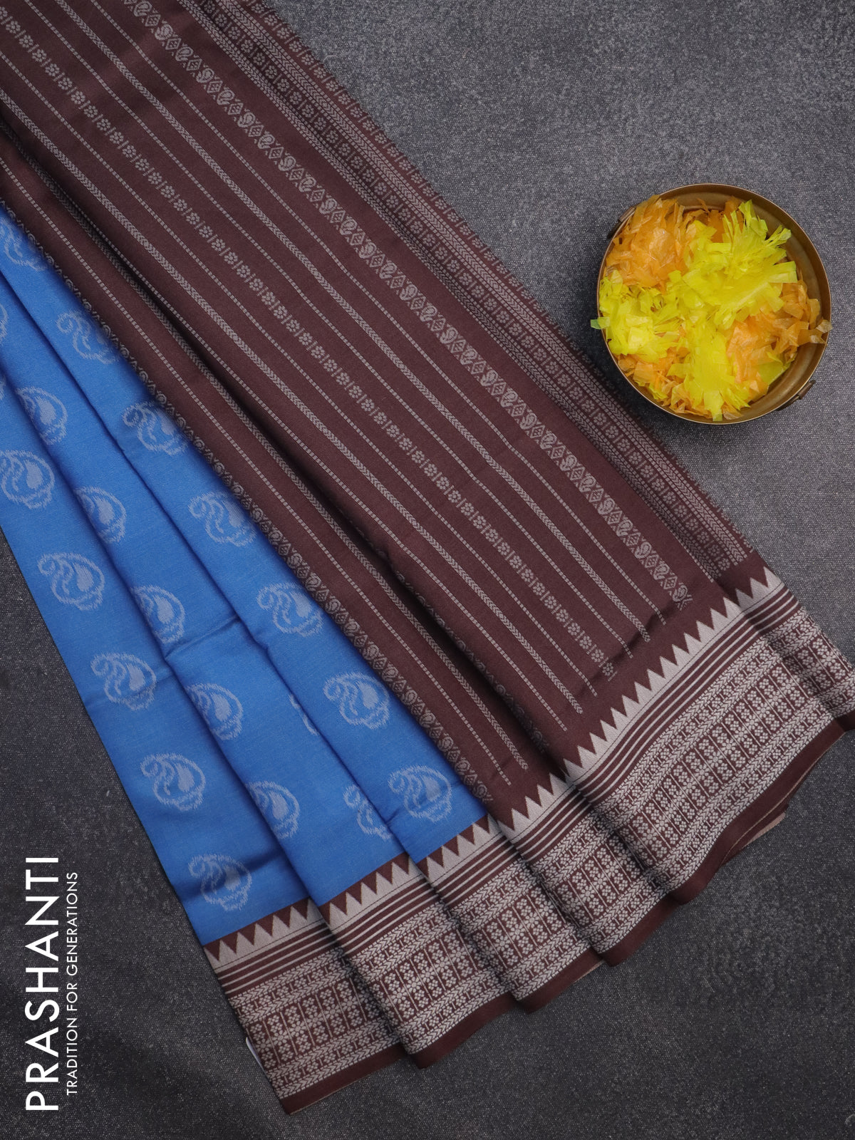 Sambalpuri semi silk saree light blue and coffee brown with allover thread woven ikat buttas and thread woven border