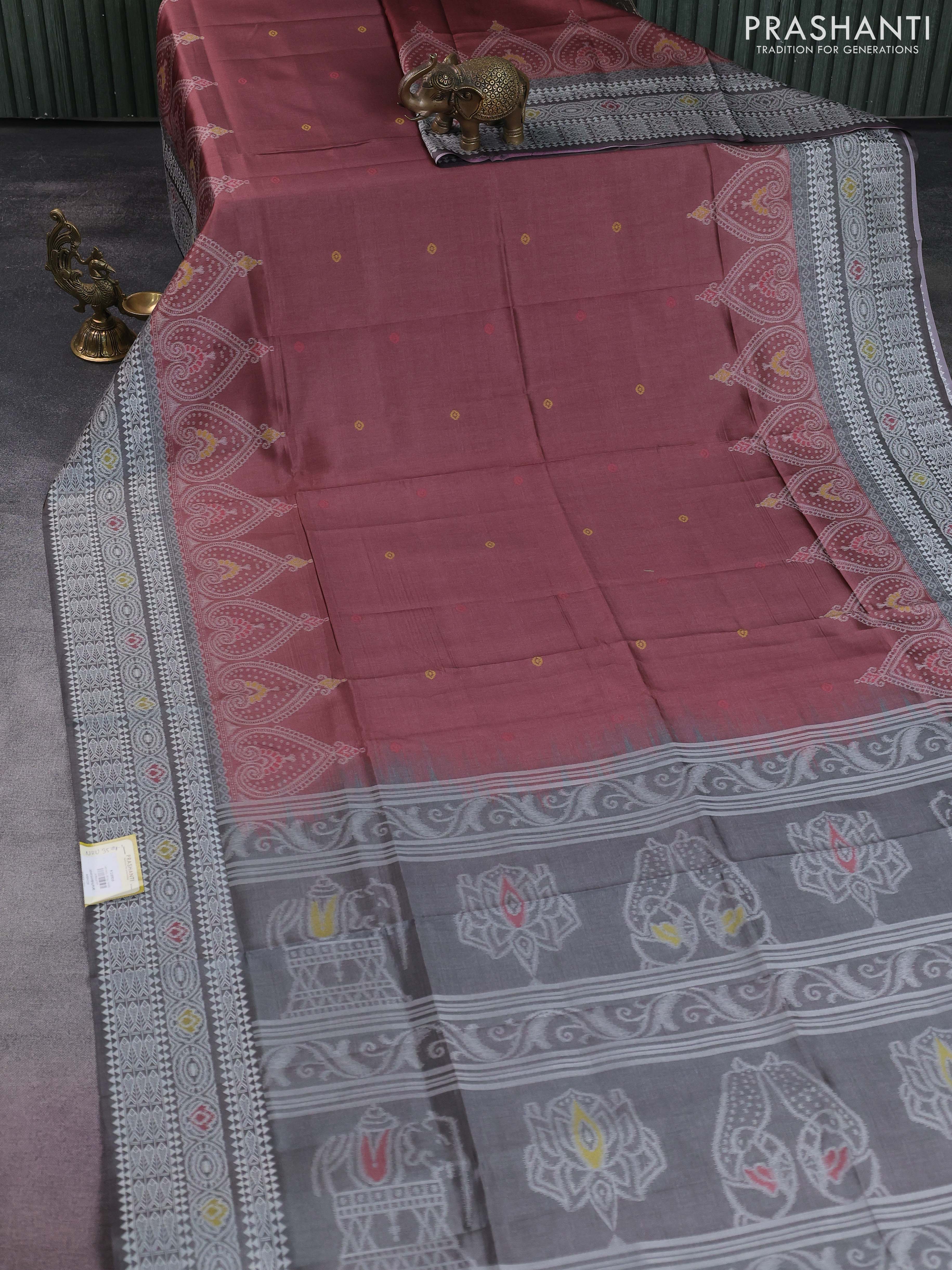 Sambalpuri semi silk saree pastel maroon and grey with thread woven buttas and ikat weaveing pallu