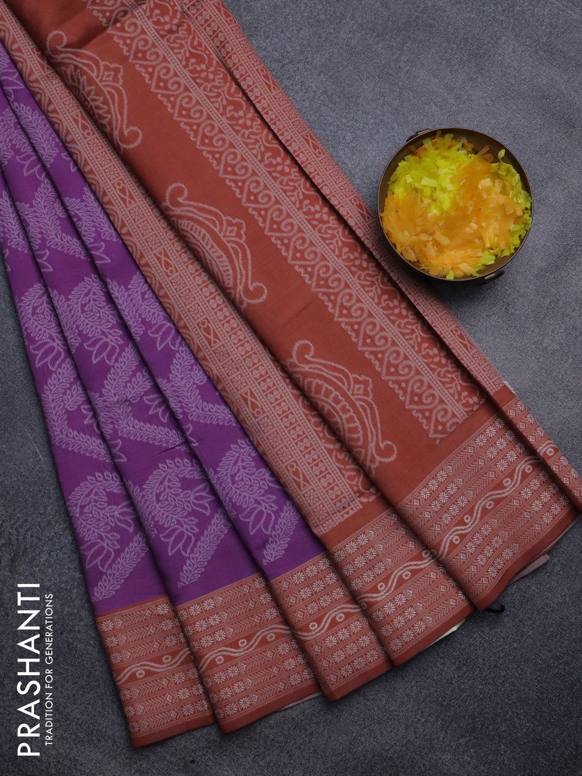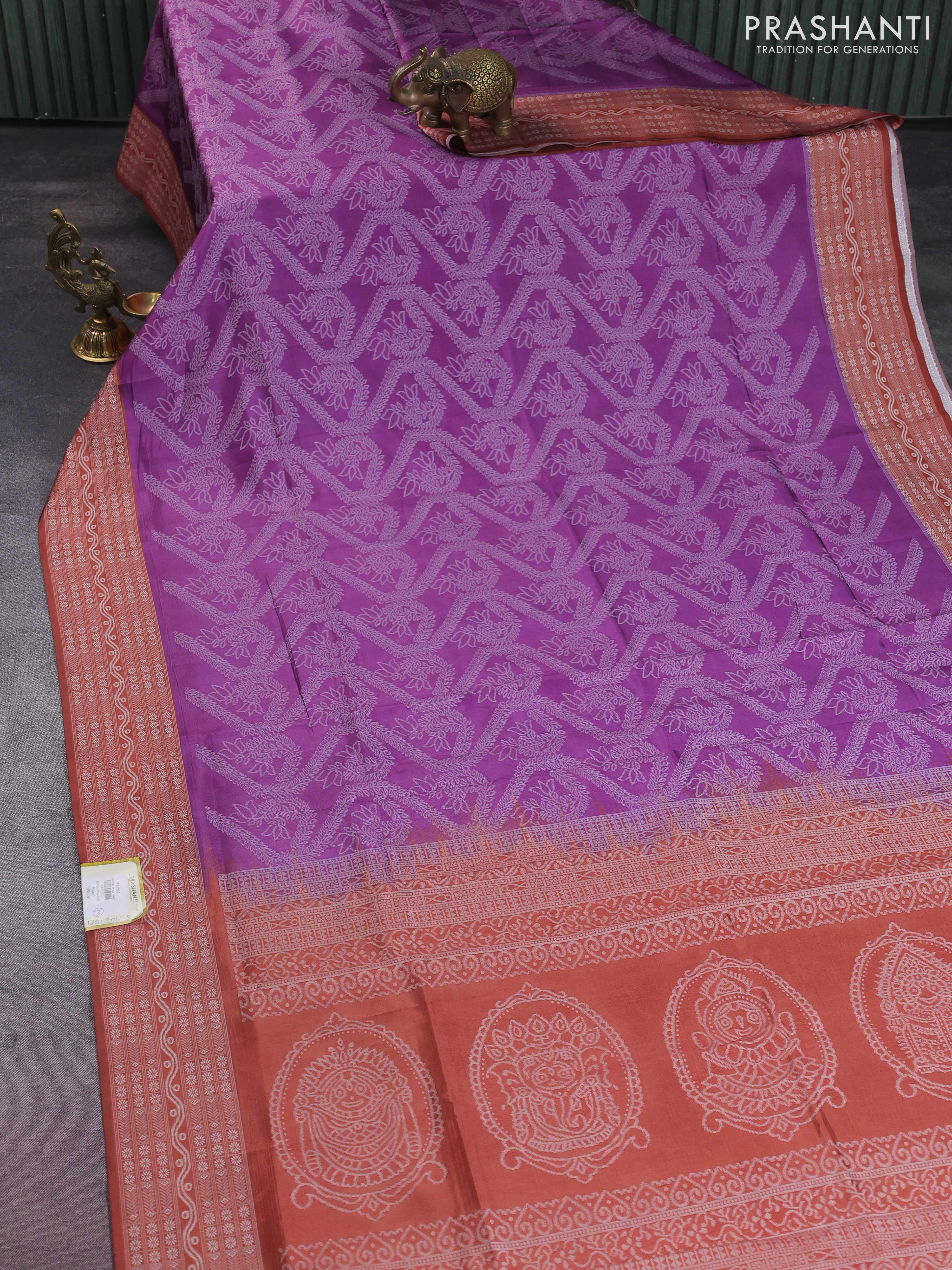 Sambalpuri semi silk saree purple and rustic orange with allover ikat weaves and thread woven border