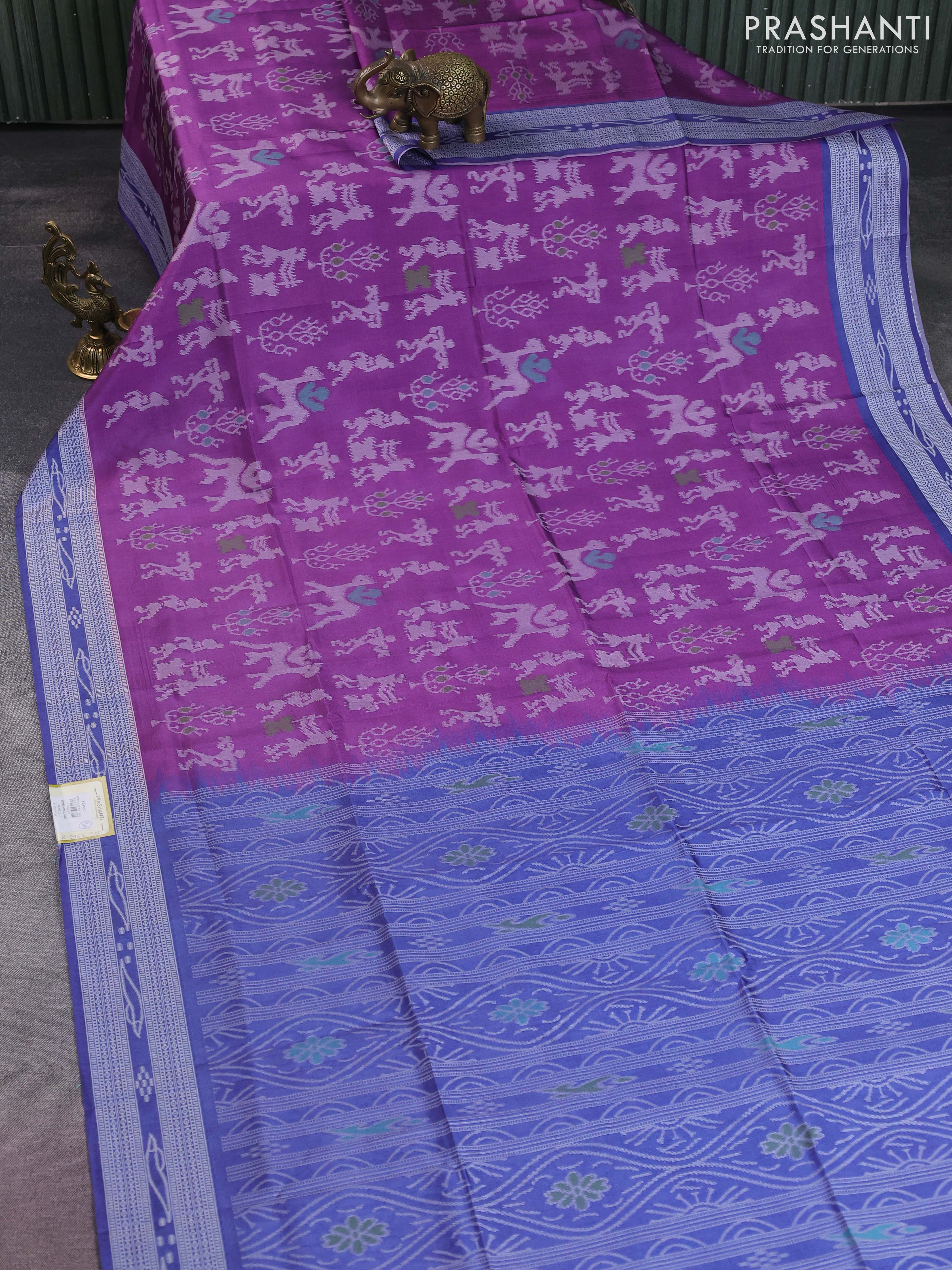 Sambalpuri semi silk saree purple shade and blue with allover warli ikat weaves and thread woven border