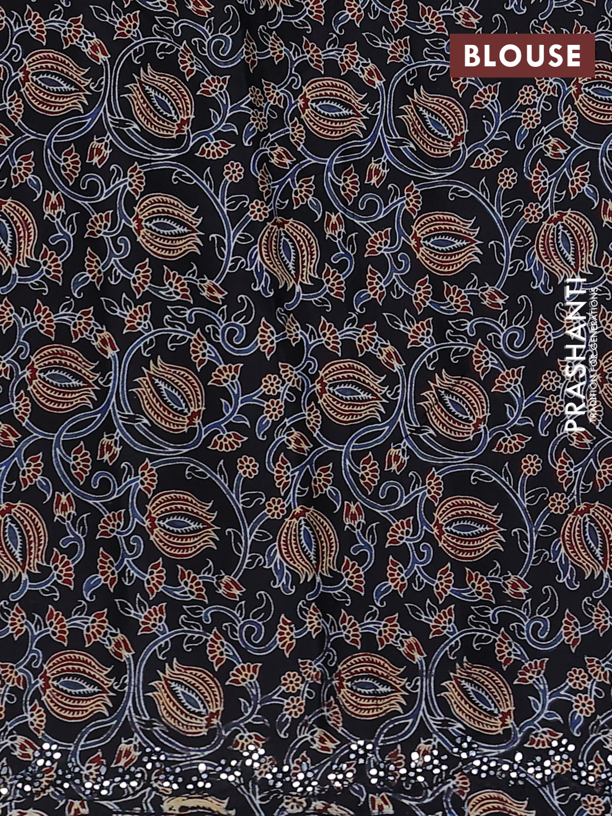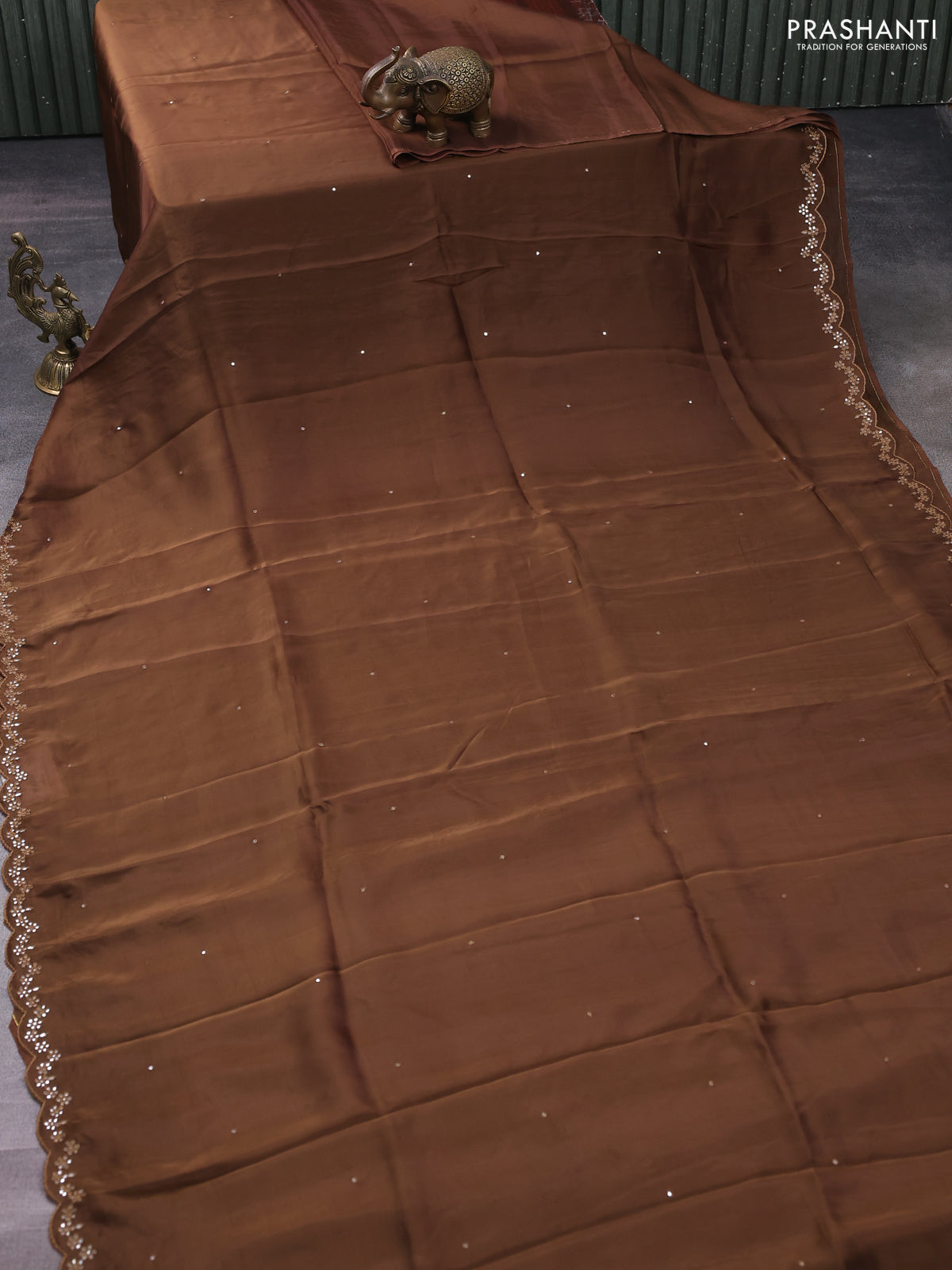 Satin crepe silk saree brown and black with allover mirror work and ajrakh printed blouse