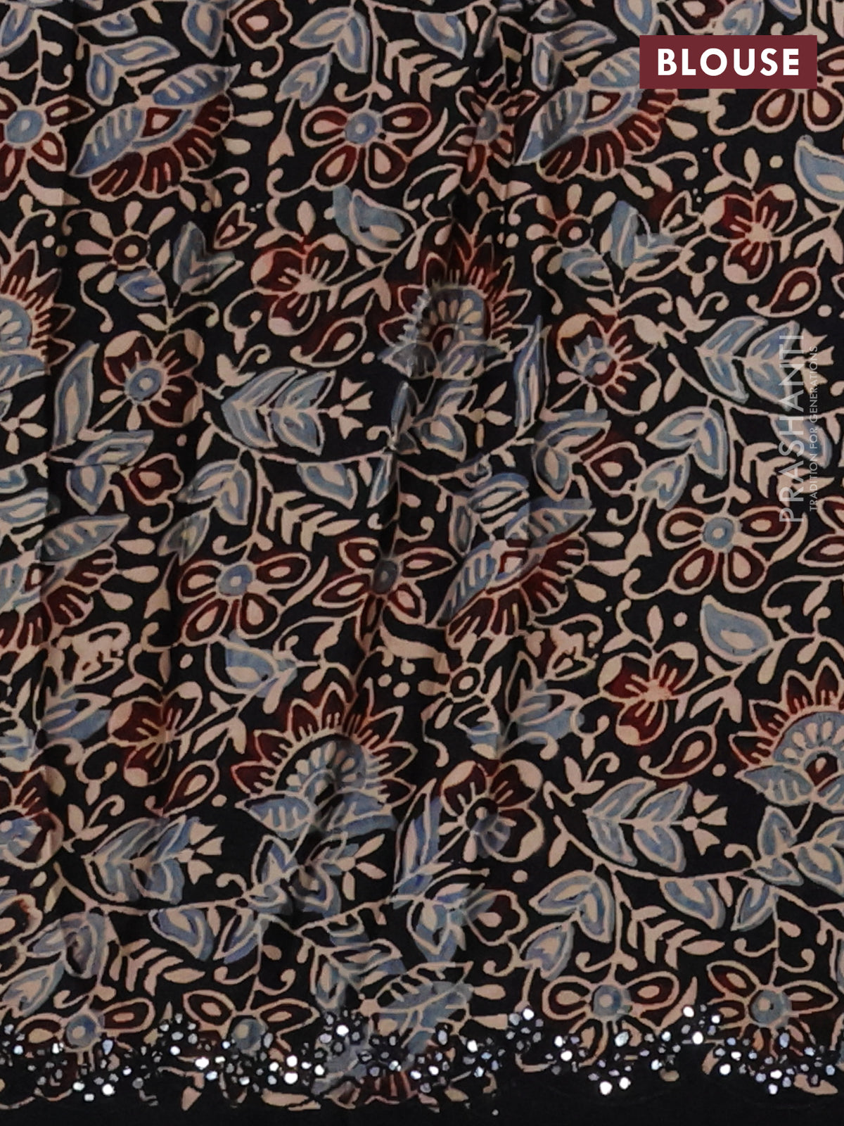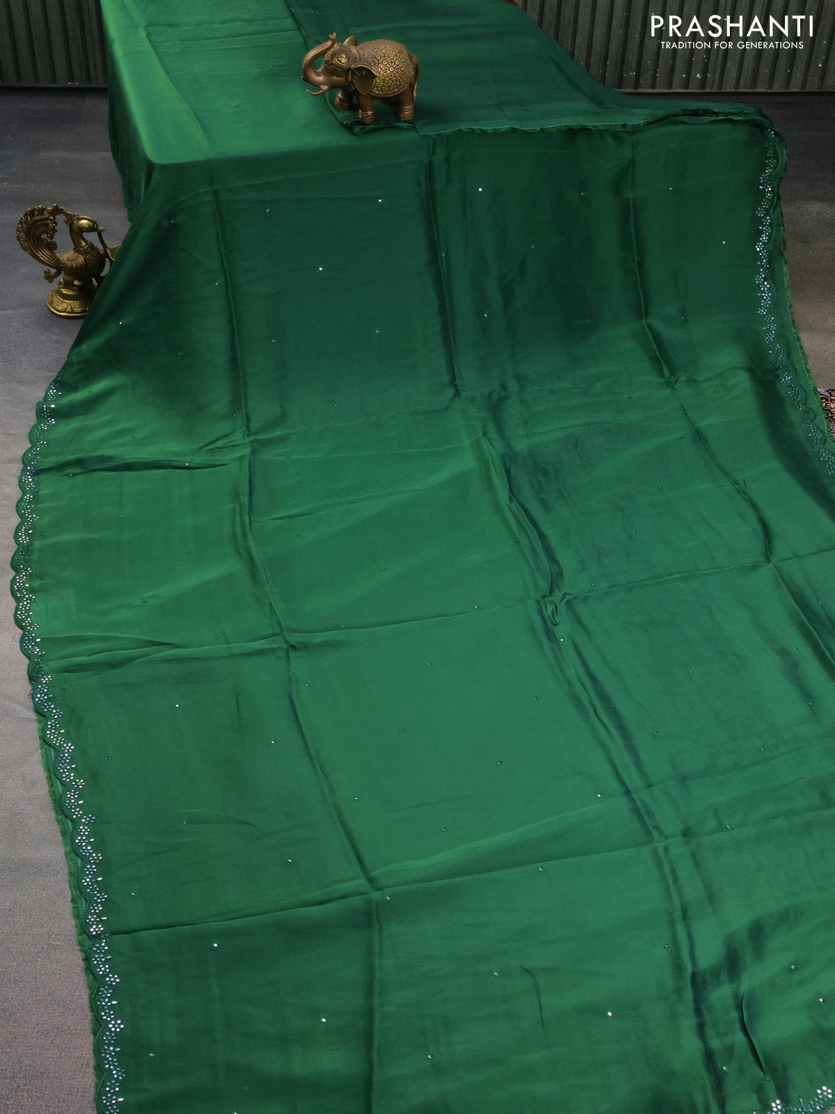Satin crepe silk saree green and black with mirror work and ajrakh printed blouse