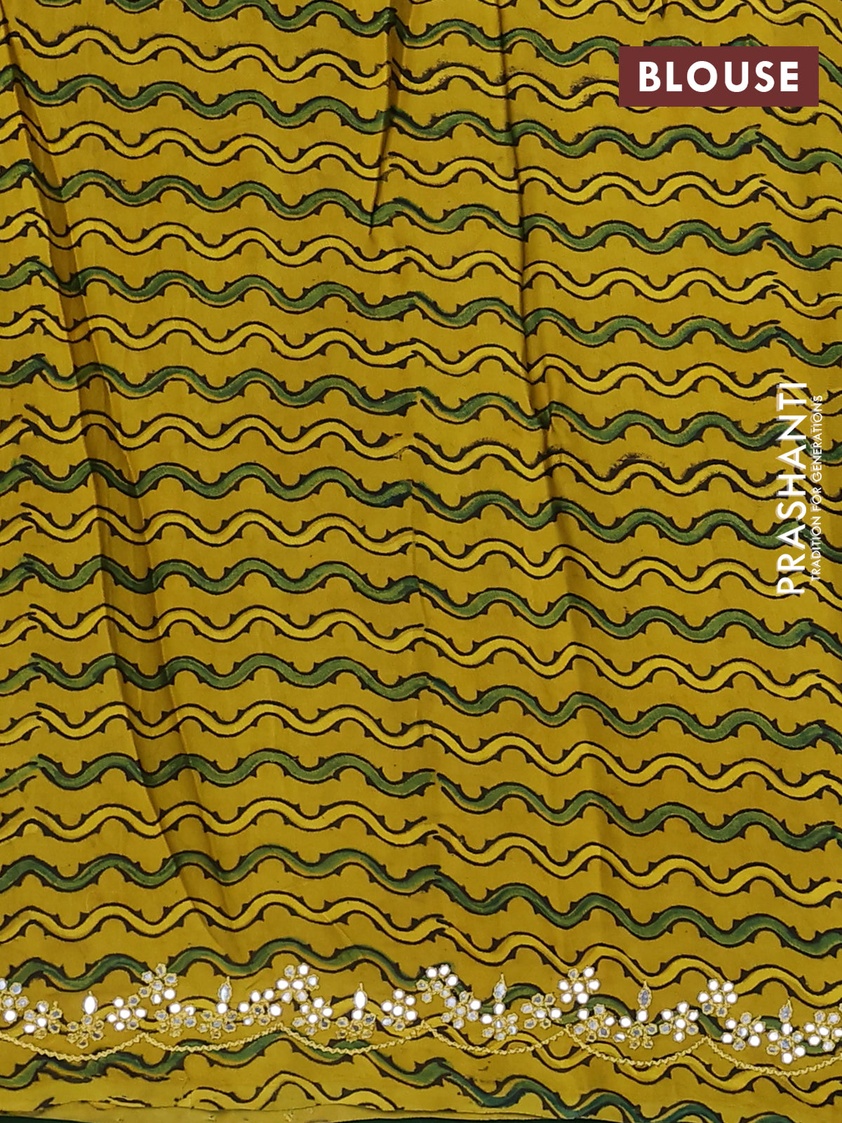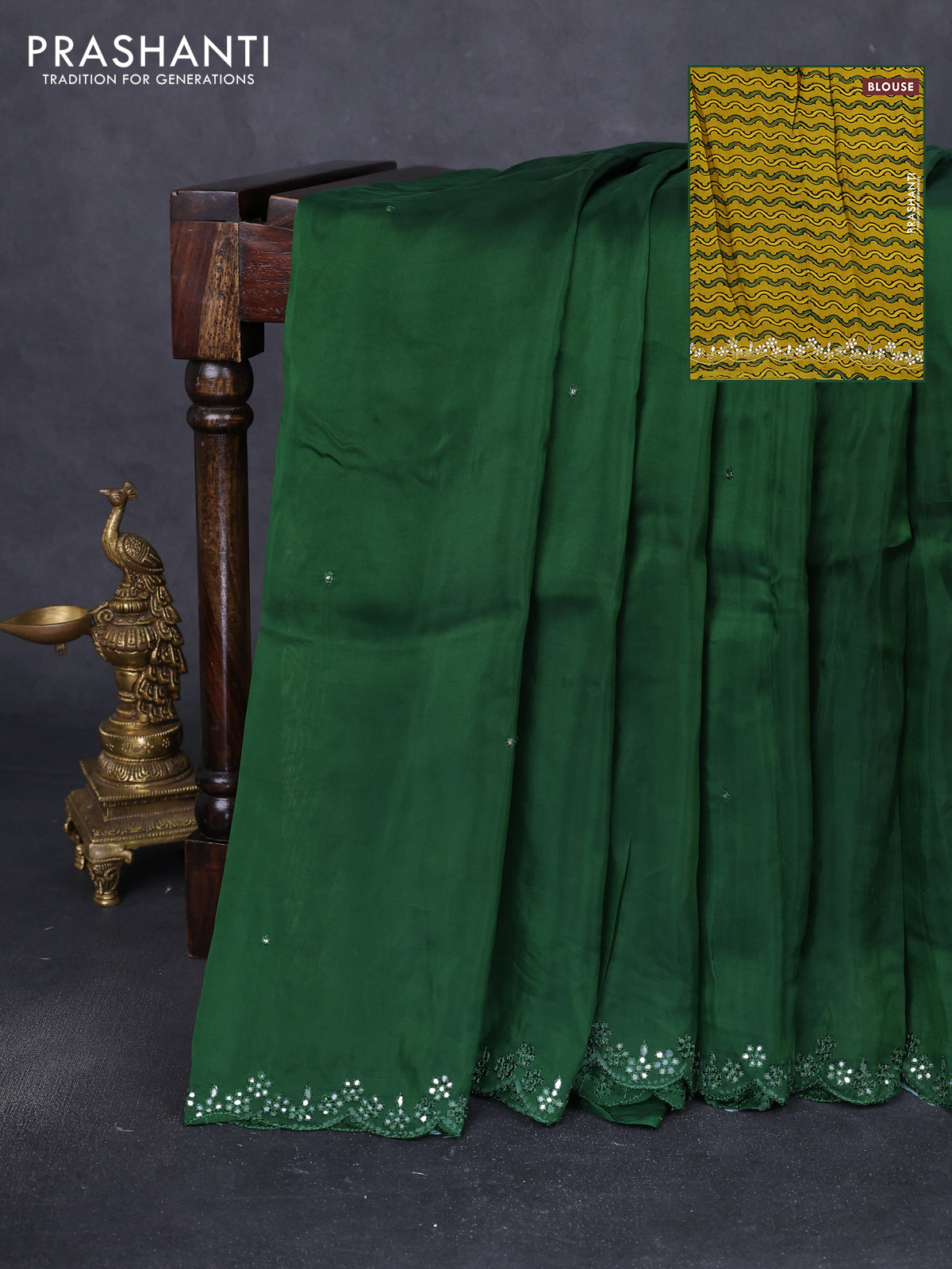 Satin crepe silk saree green and mustard yellow with allover mirror work and ajrakh printed blouse