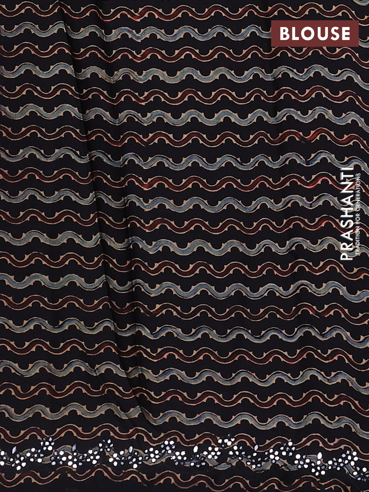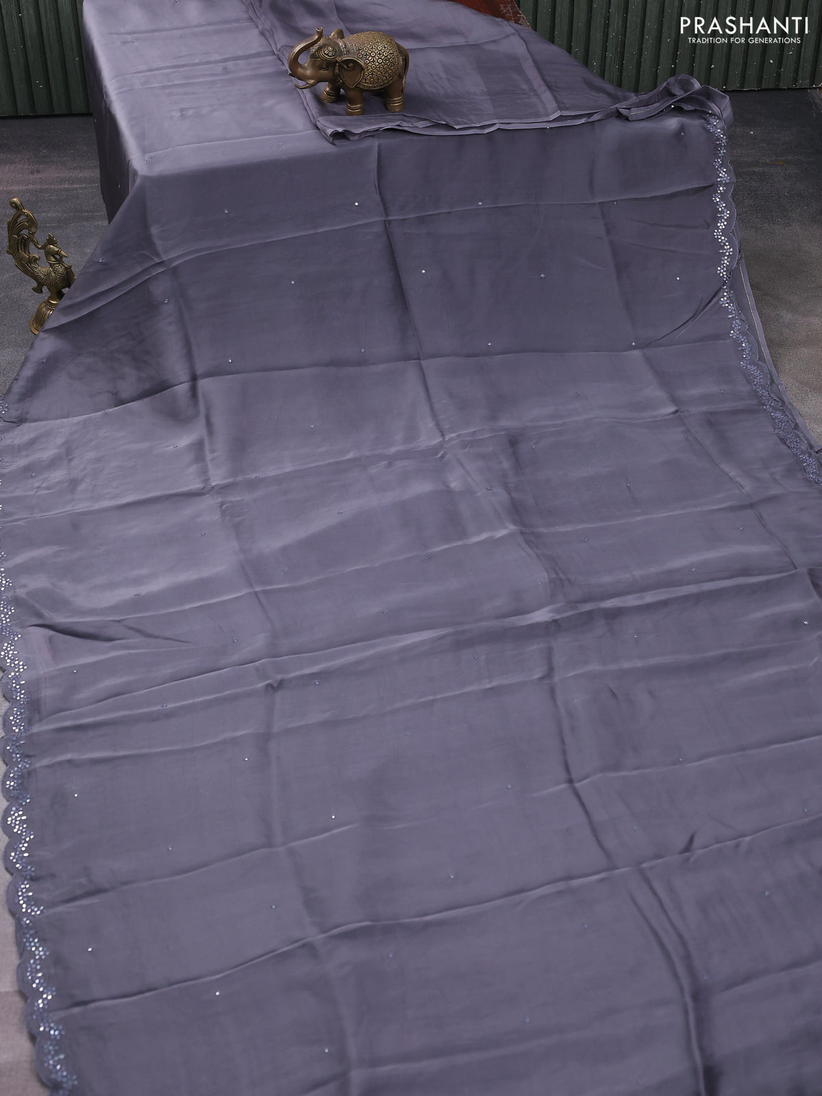 Satin crepe silk saree grey and black with allover mirror work and ajrakh printed blouse