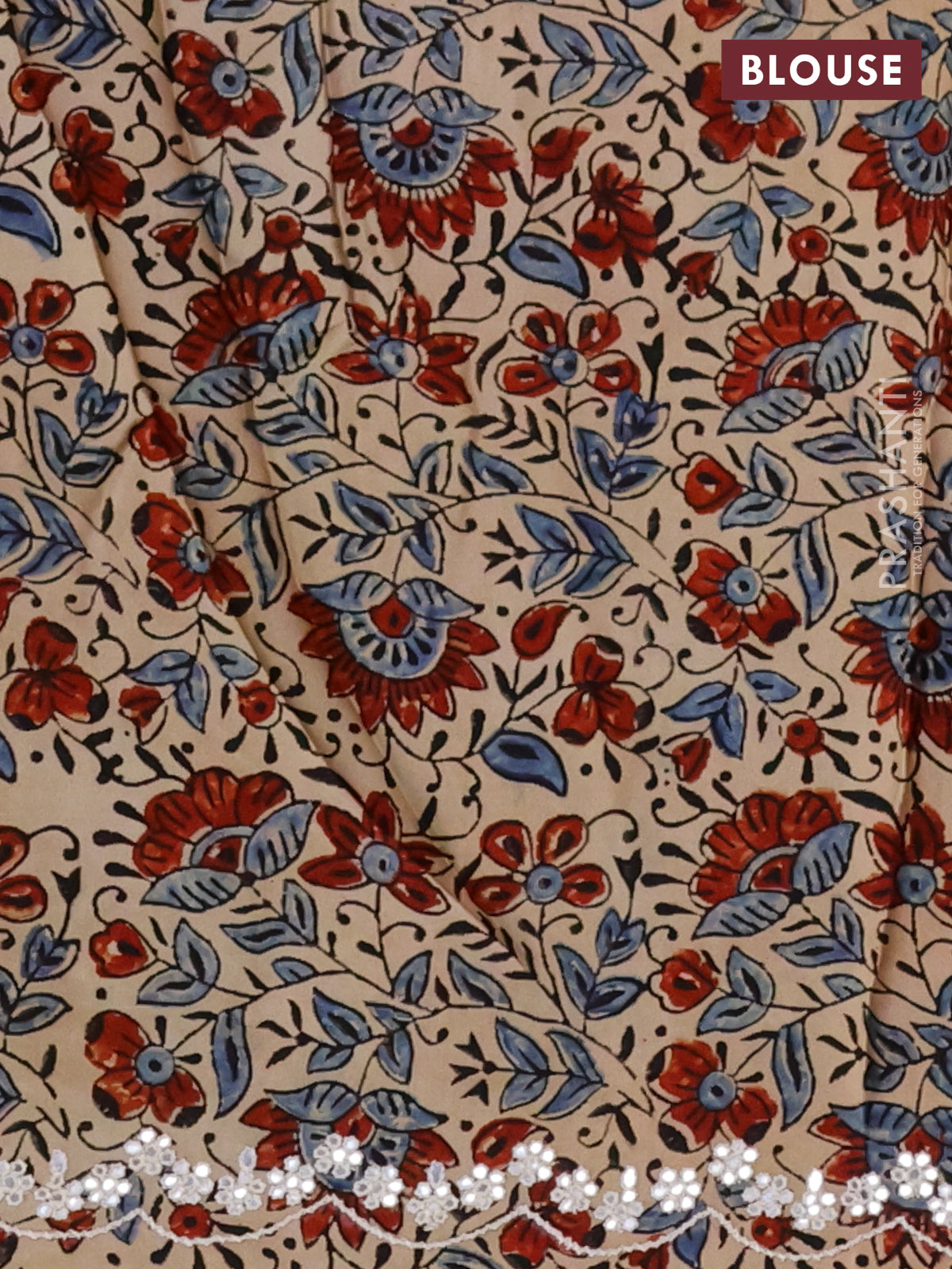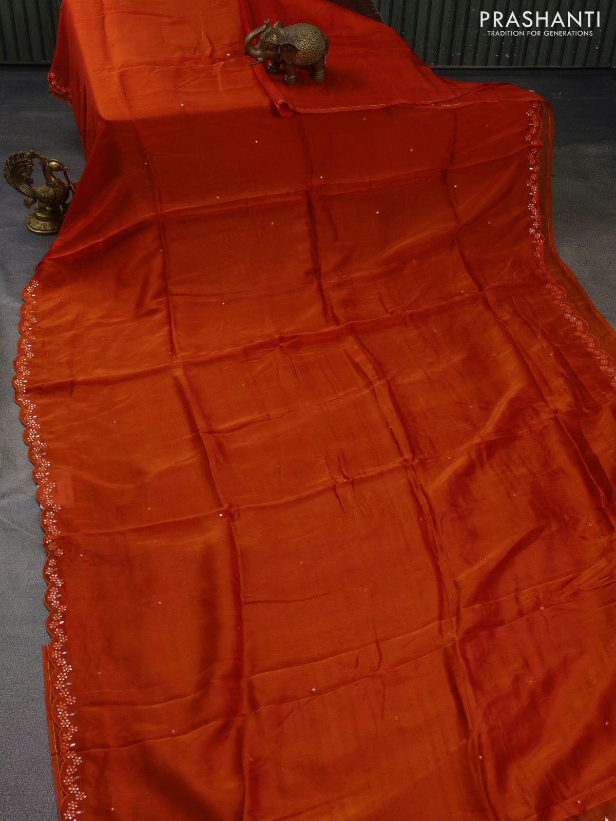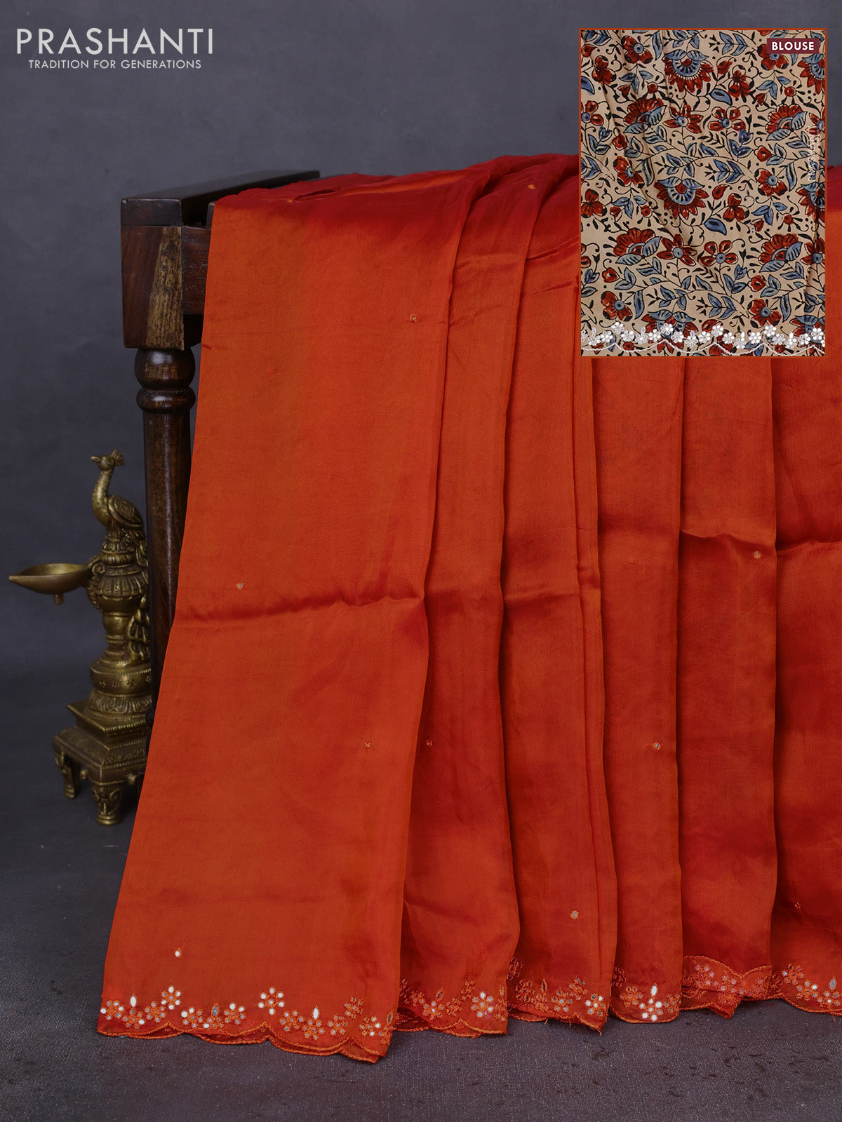 Satin crepe silk saree orange and beige with mirror work and ajrakh printed blouse