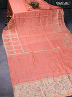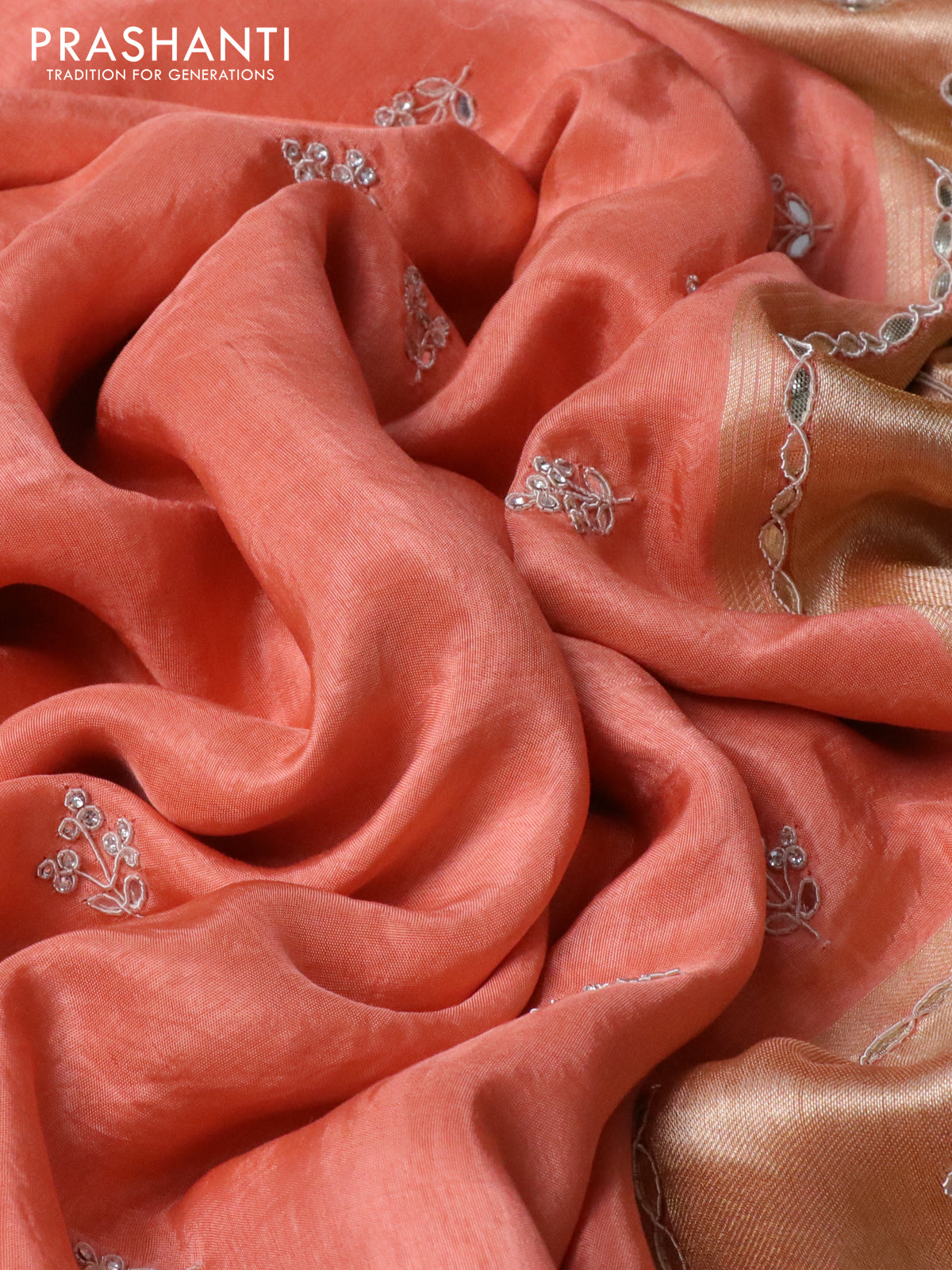 Satin crepe silk saree peach orange with mirror work buttas and zari checked & stone work border