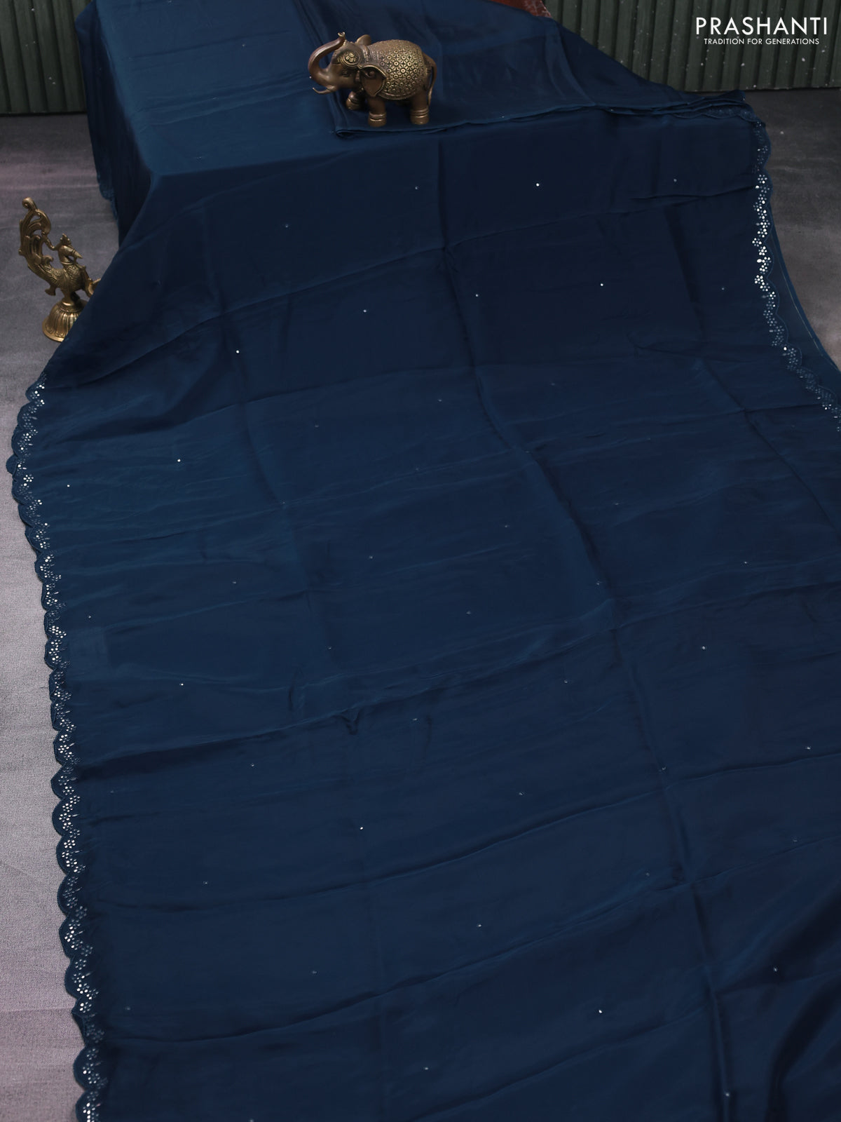 Satin crepe silk saree peacock blue and maroon with allover mirror work and ajrakh printed blouse