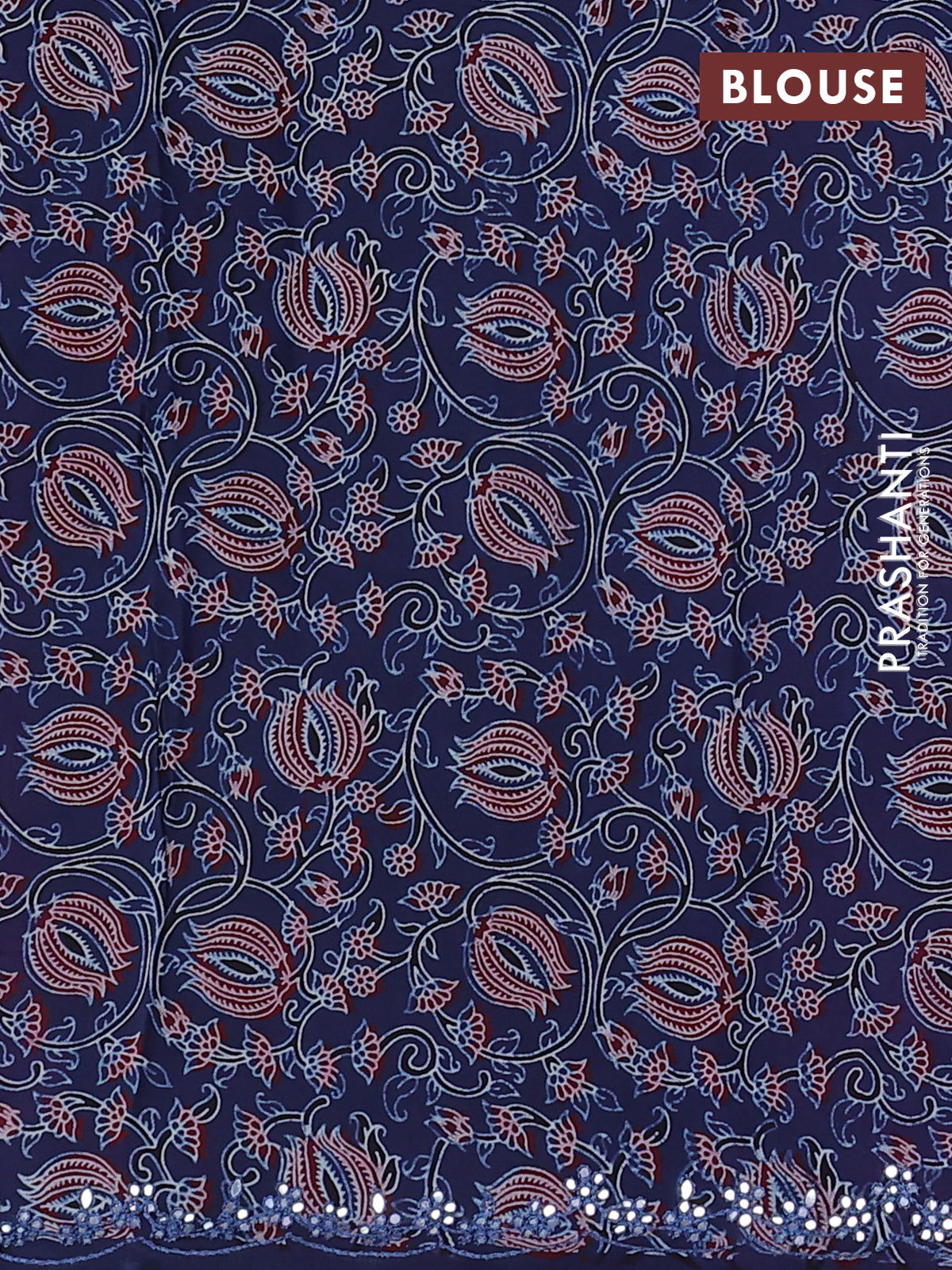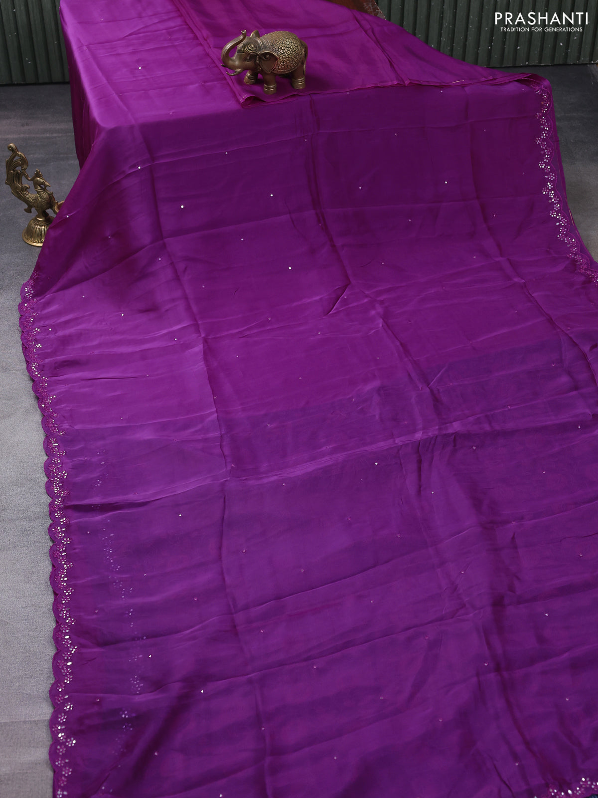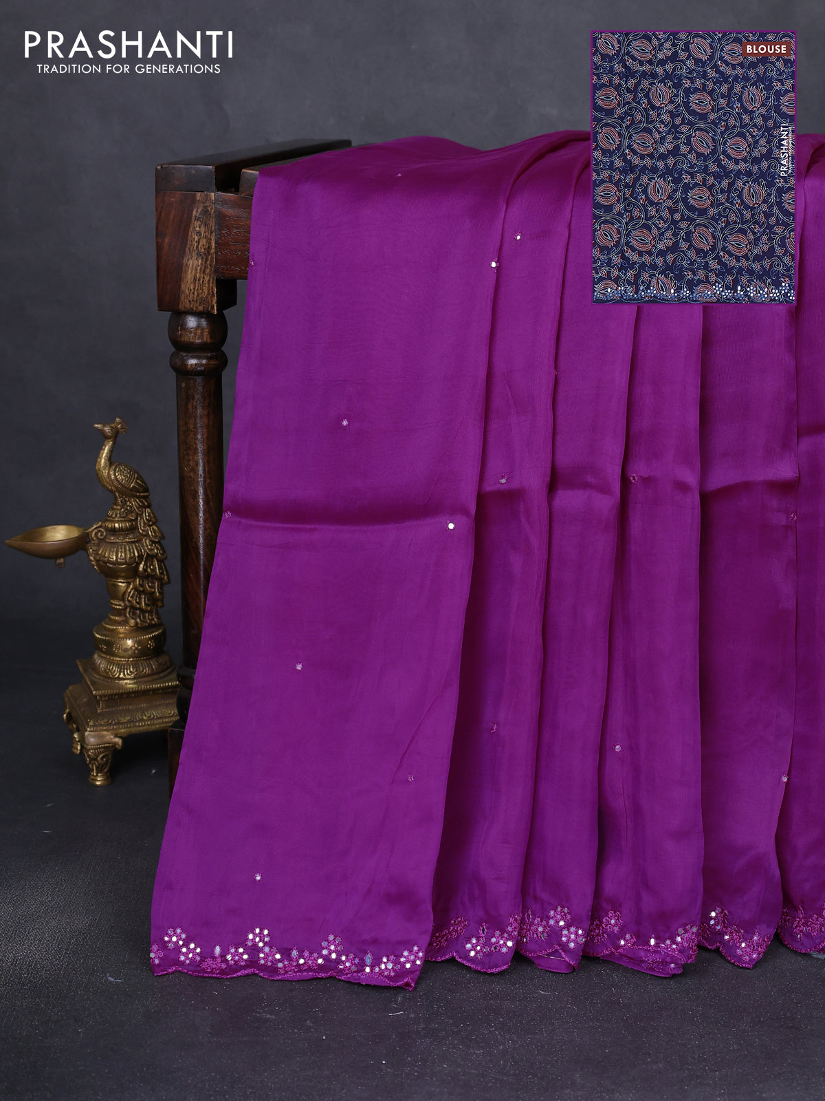 Satin crepe silk saree purple and blue with allover mirror work and ajrakh printed blouse