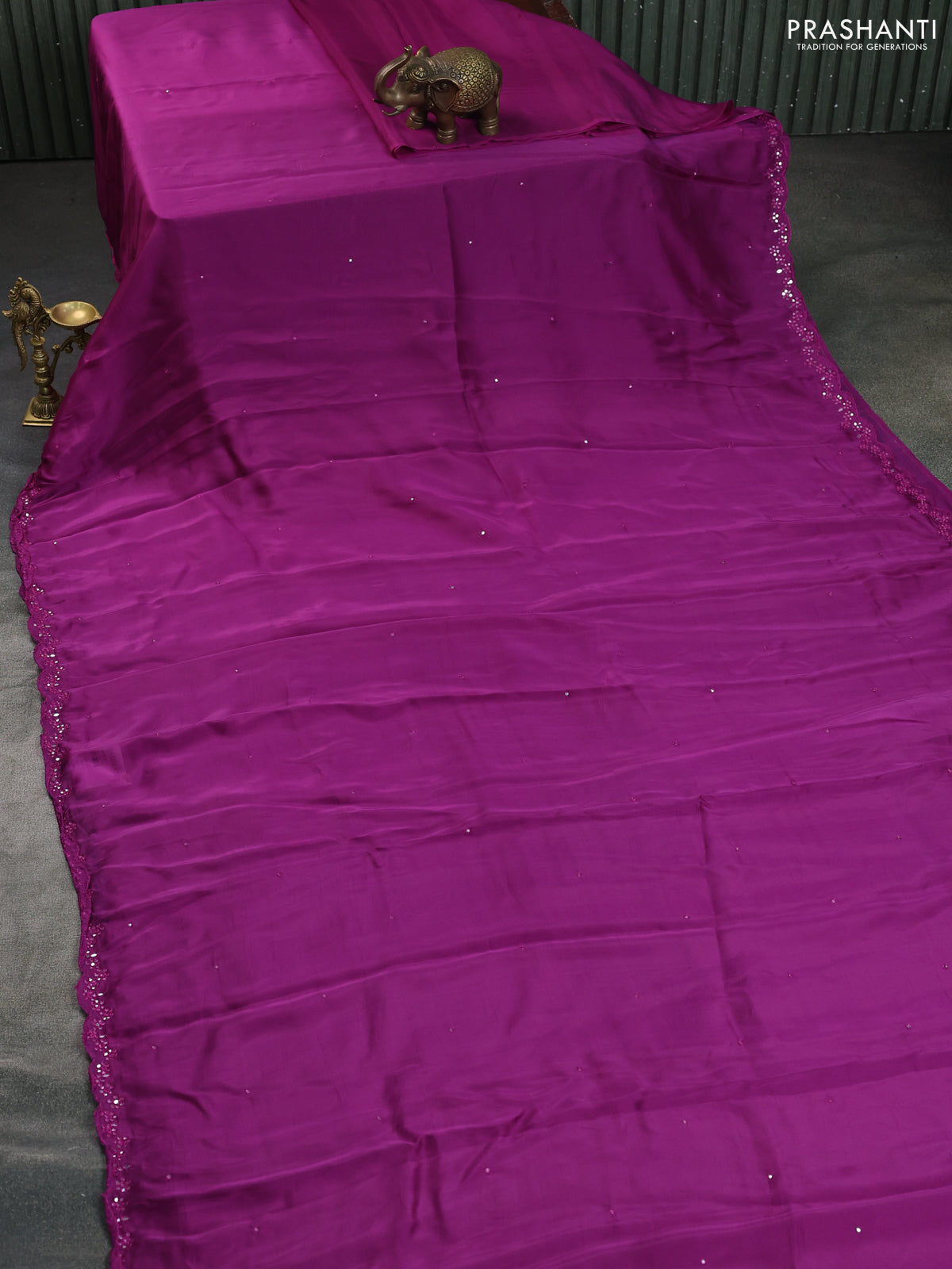 Satin crepe silk saree purple and blue with mirror work and ajrakh printed blouse