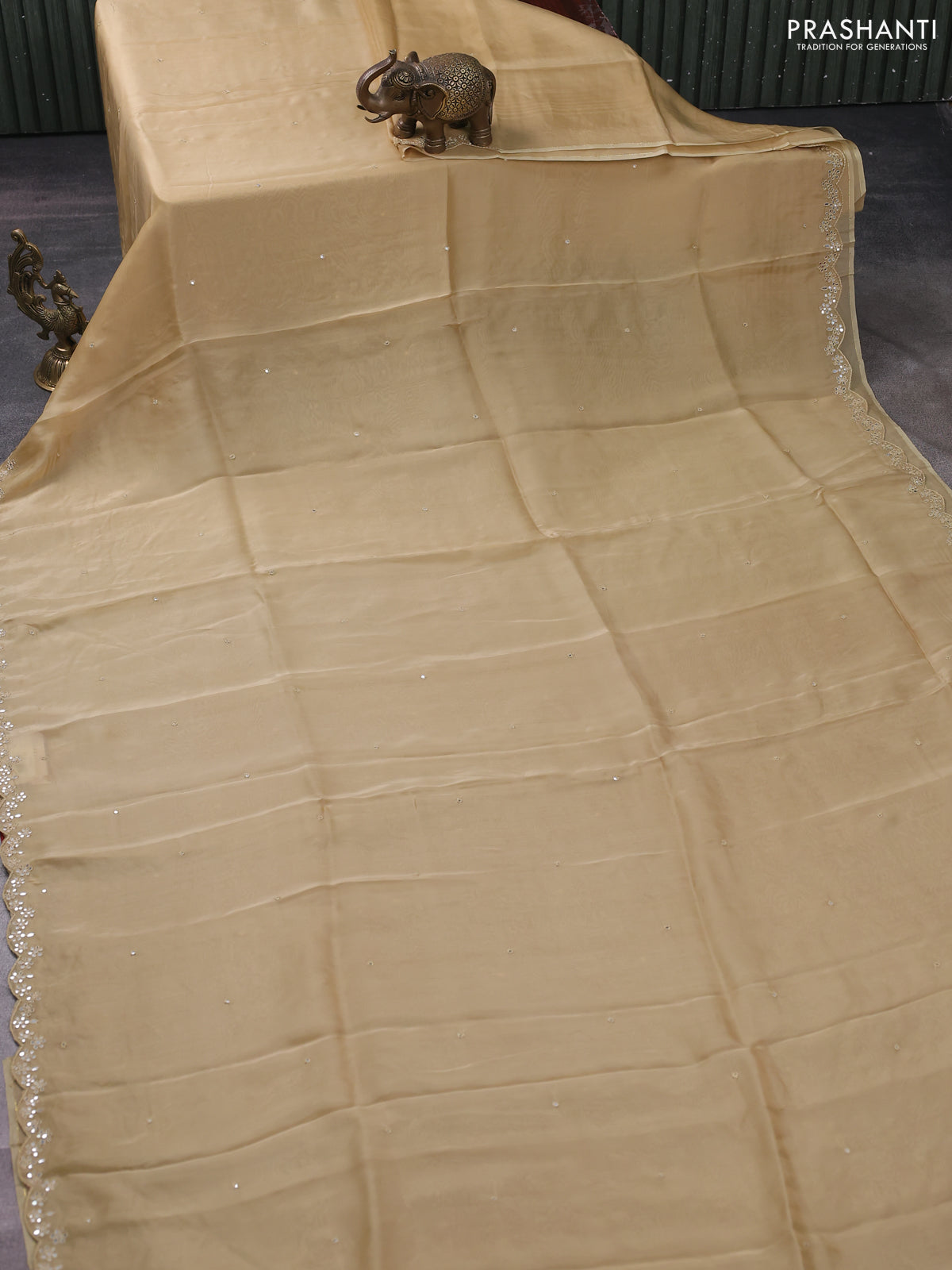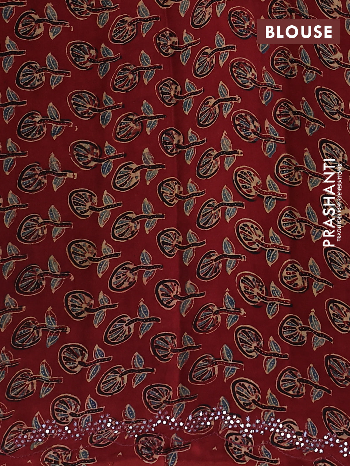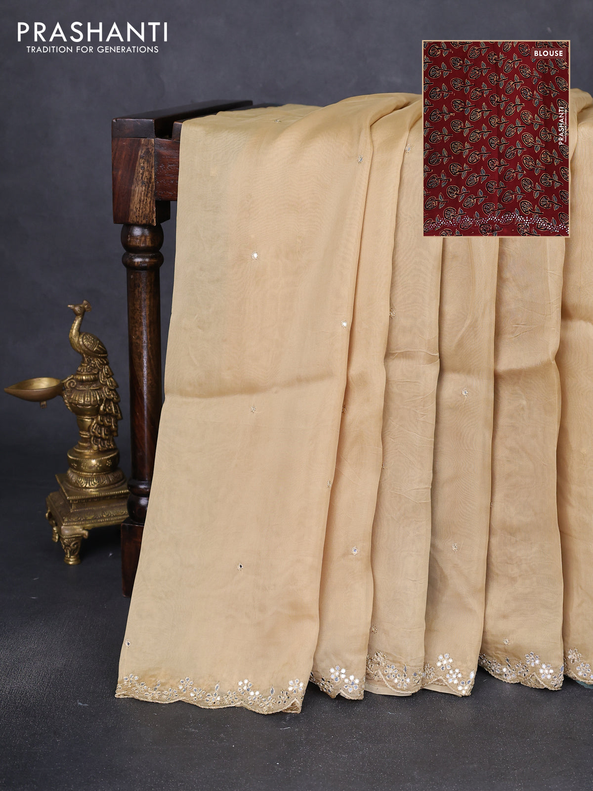 Satin crepe silk saree sandal and maroon with allover mirror work and ajrakh printed blouse