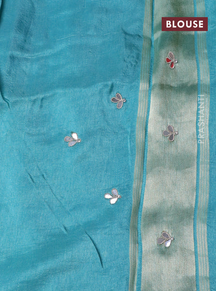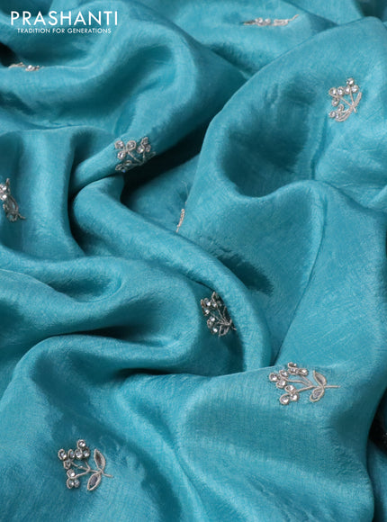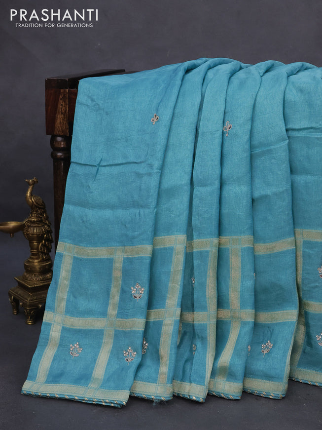Satin crepe silk saree teal blue with mirror work buttas and zari checked & stone work border