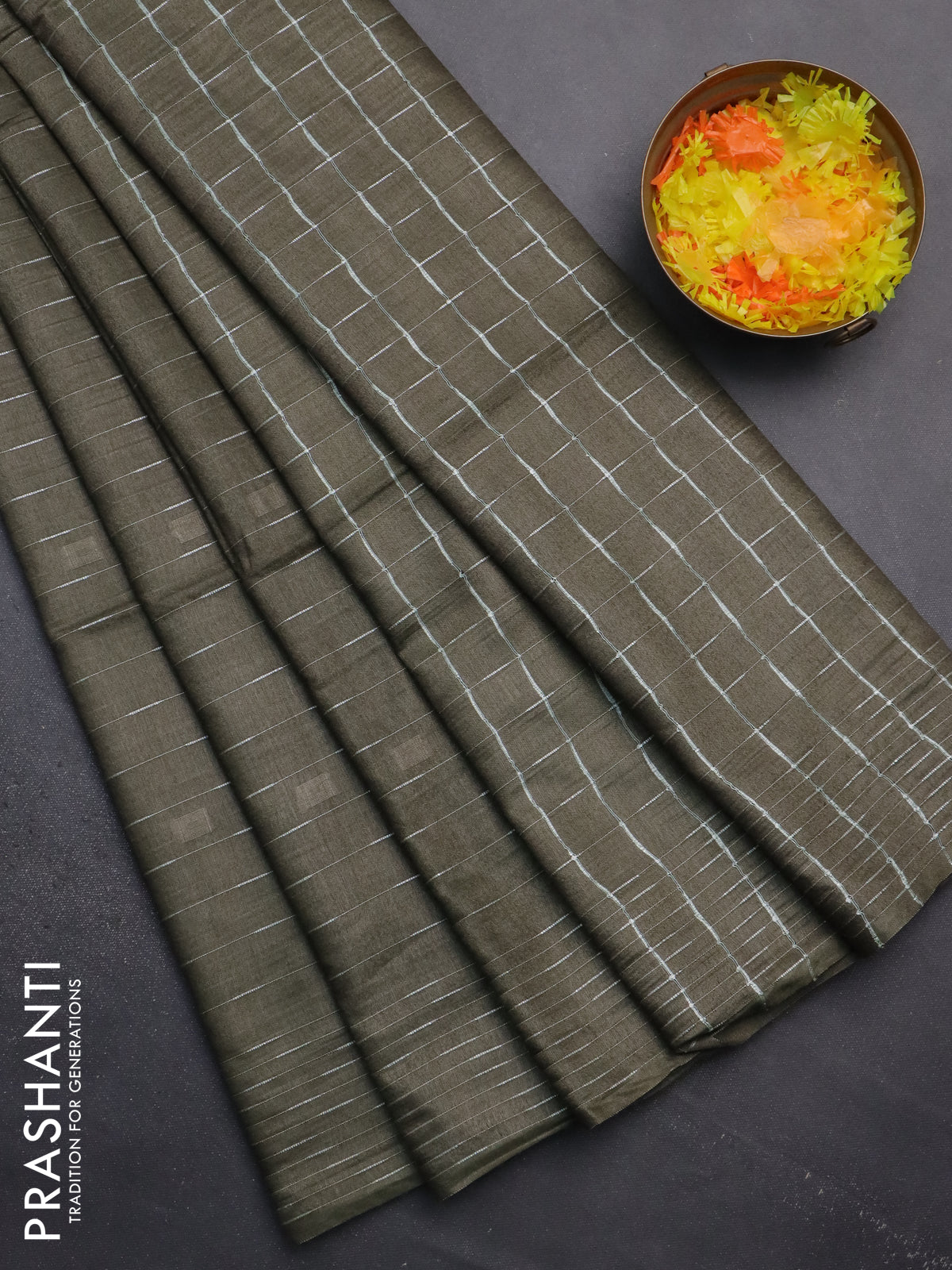 Semi bamboo saree military green with allover thread weaves and woven border