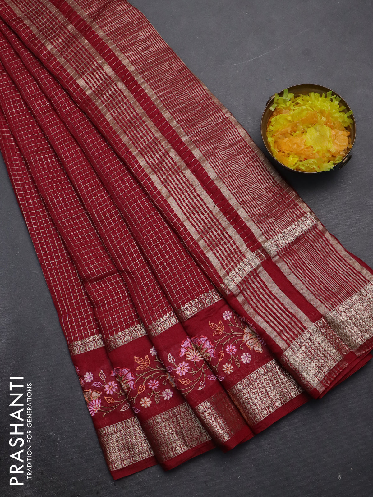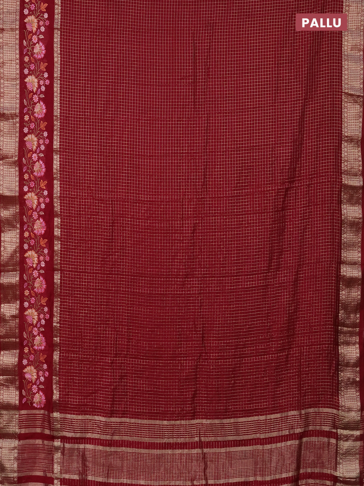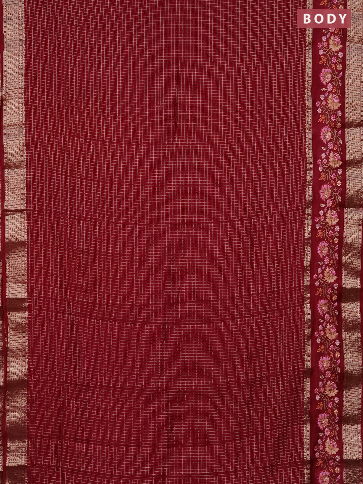 Semi chanderi saree maroon with allover zari checked pattern and floral embroidery border