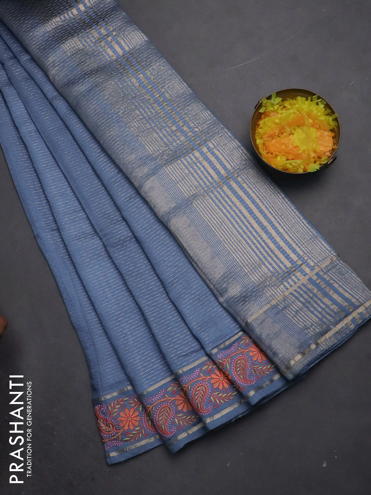 Semi chanderi saree pastel blue with allover zari woven stripes pattern and embroidery border