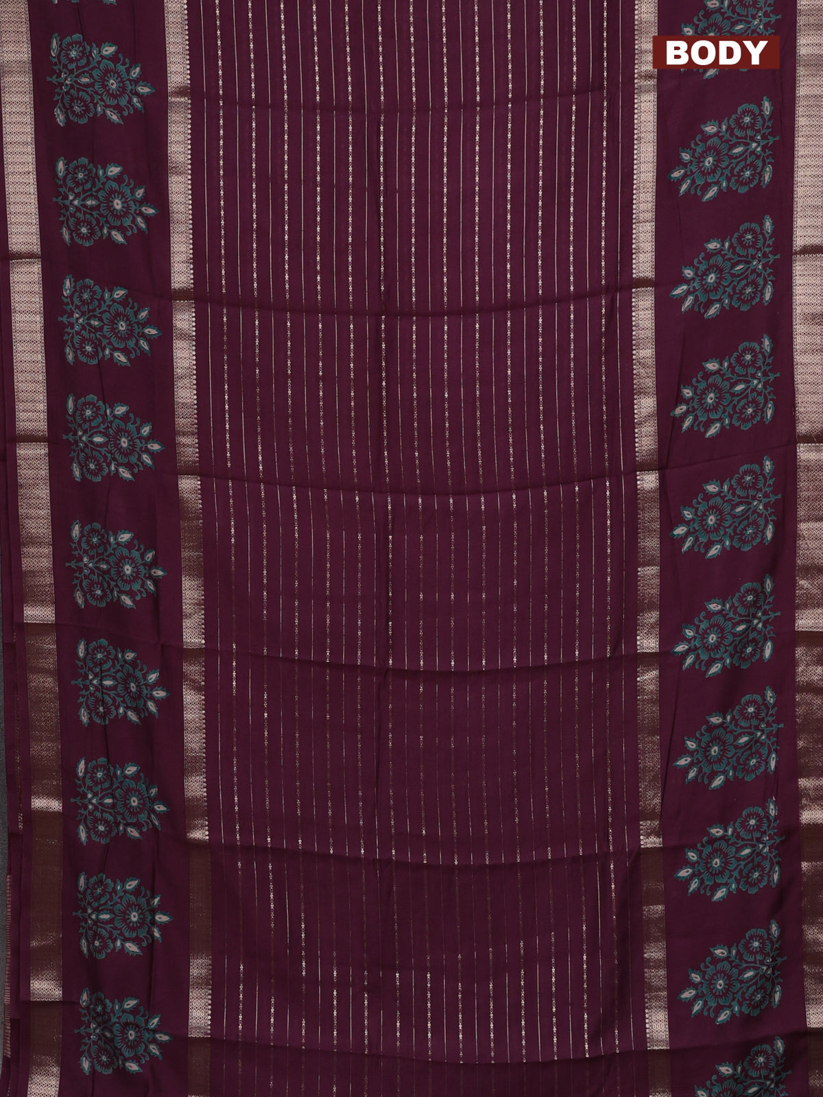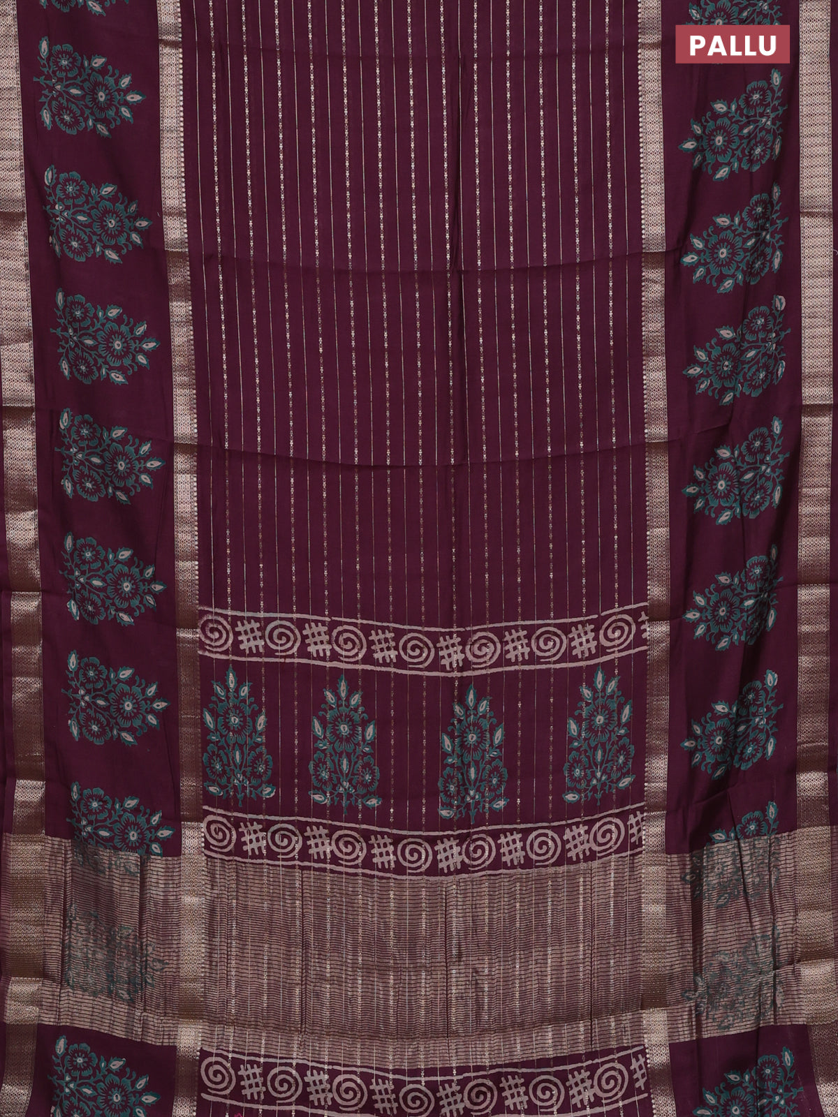 Semi chanderi saree wine shade with allover zari weaves and long printed butta zari border