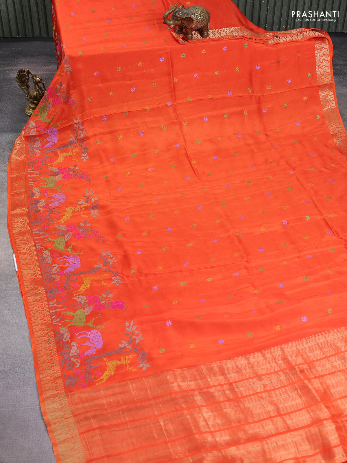 Semi crepe silk saree orange with allover convent embroidery and peacock zari woven border