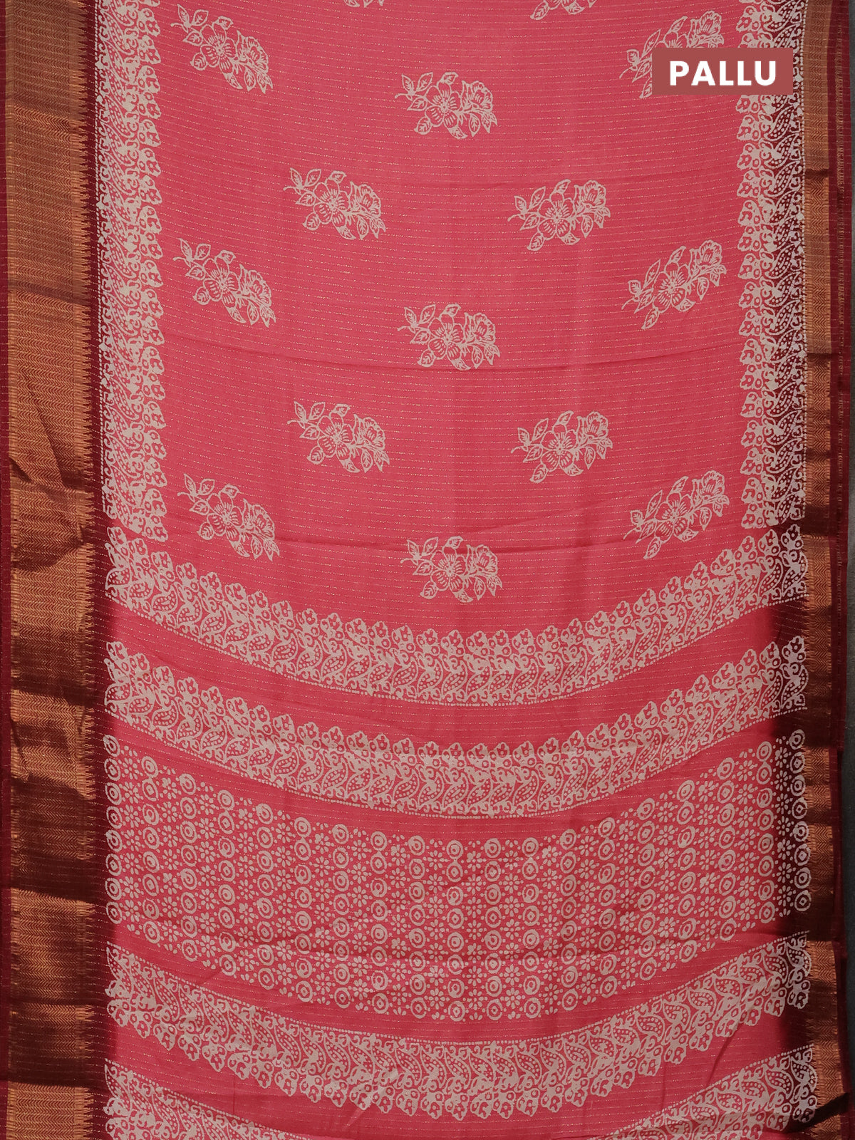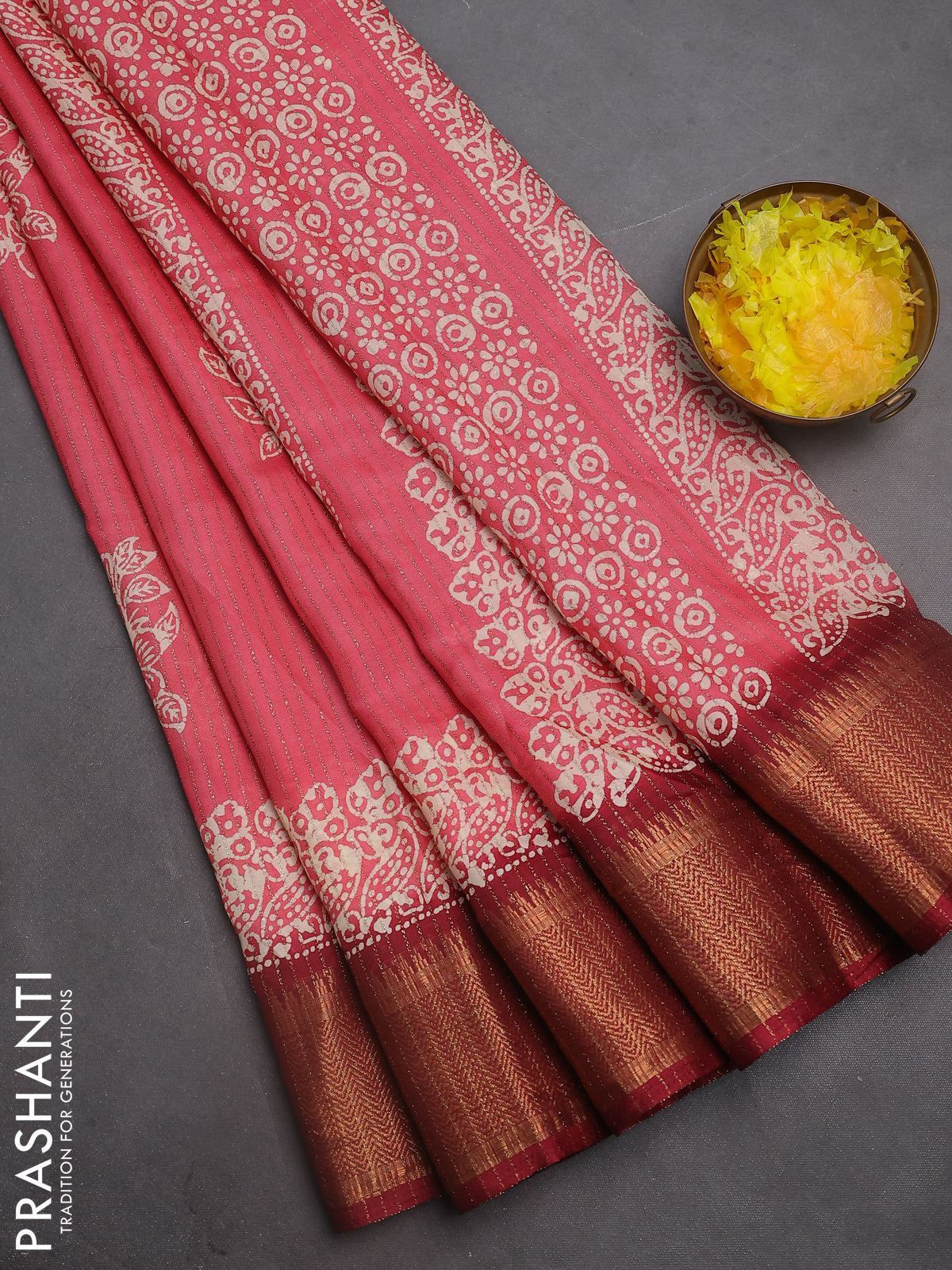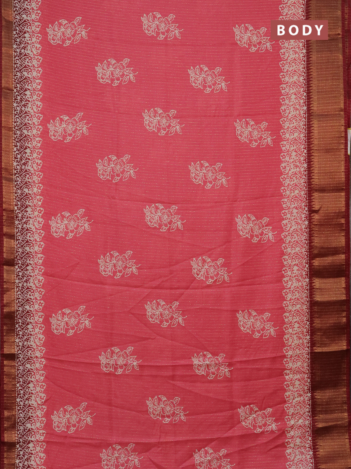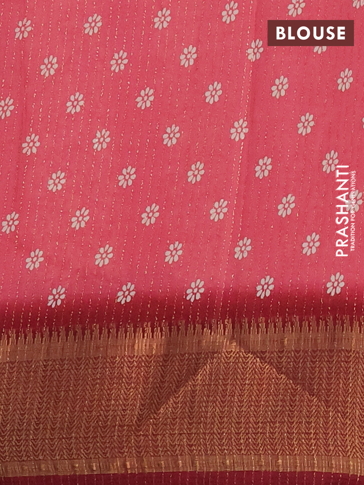 Semi dola saree peach pink and maroon with zari stripes pattern & butta prints and zari woven border