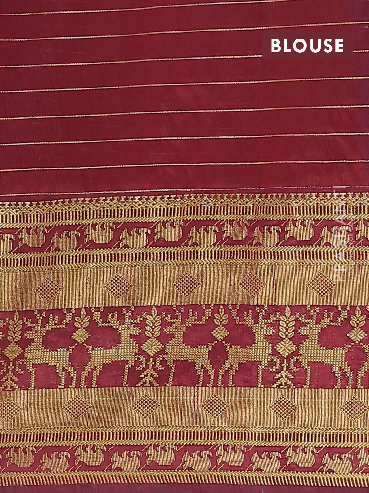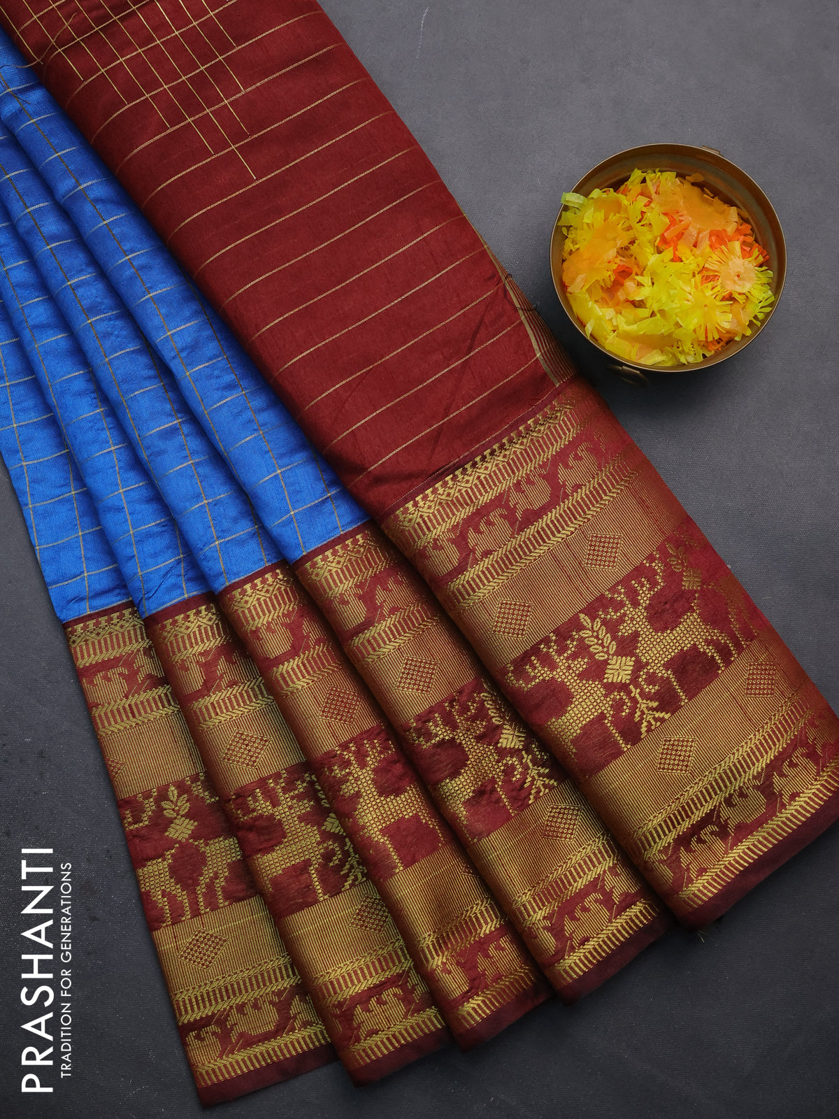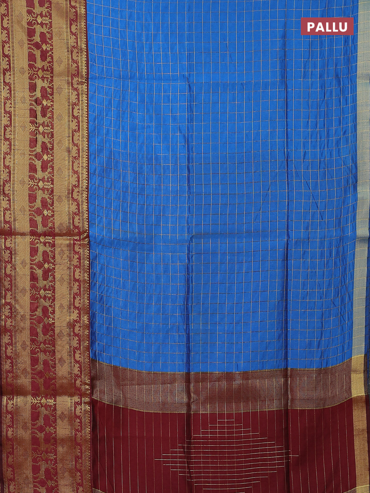 Semi dupion saree blue and maroon with allover zari checked pattern and long zari woven border