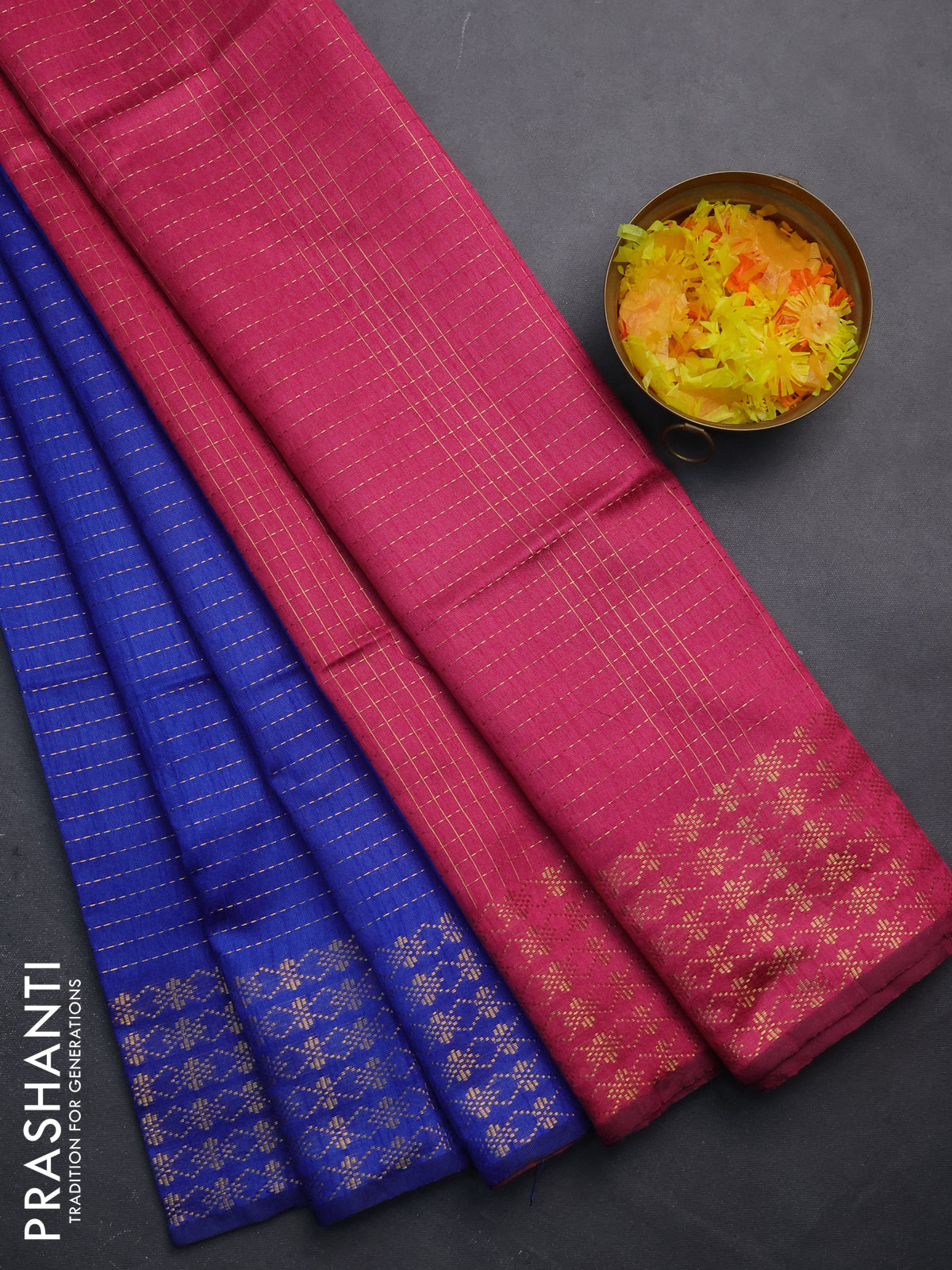 Semi dupion saree blue and pink with allover zari stripe weaves and zari woven border
