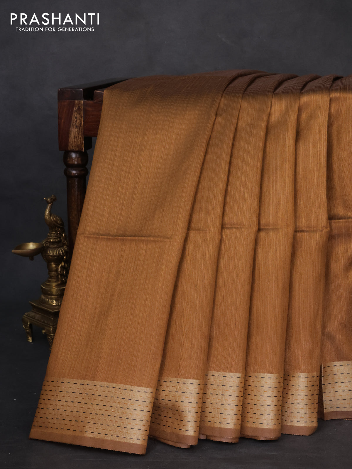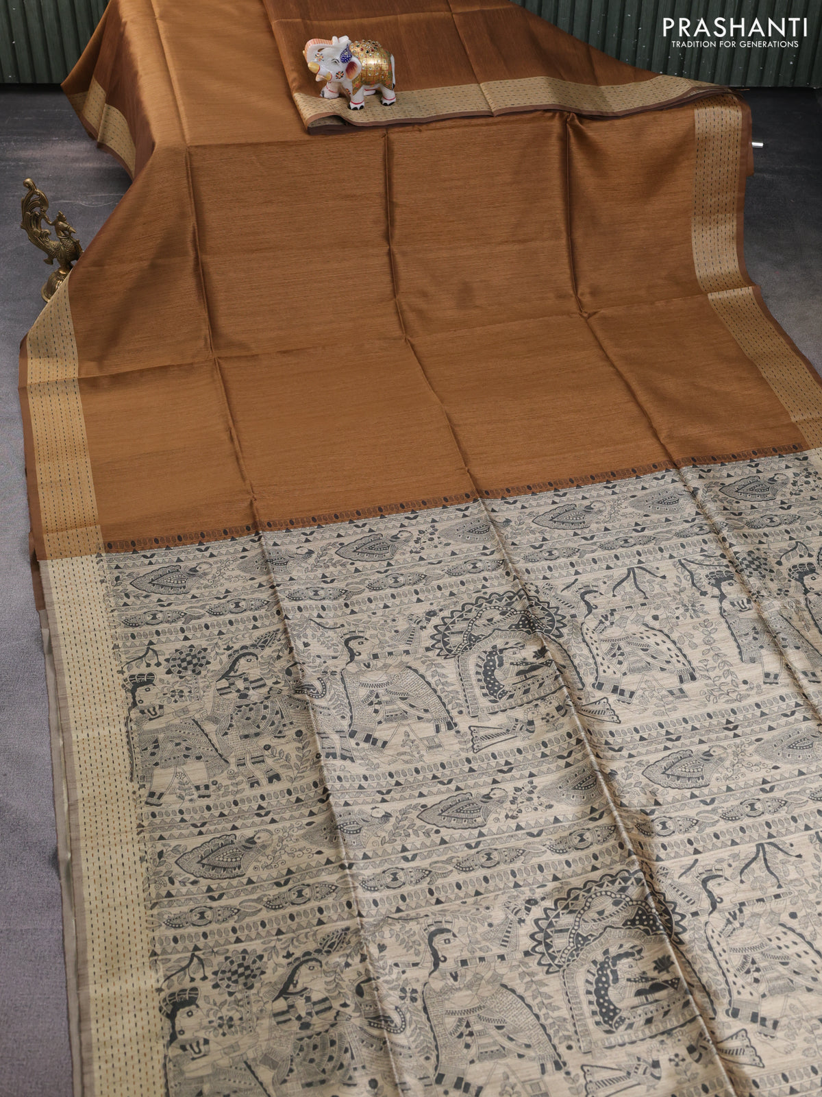 Semi dupion saree dark mustard and beige with plain body and madhubani printed pallu
