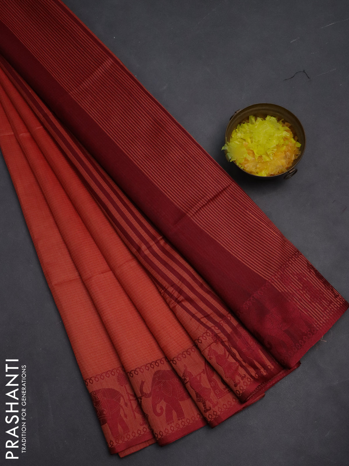 Semi dupion saree dark peach and maroon with allover stripe pattern and thread woven border