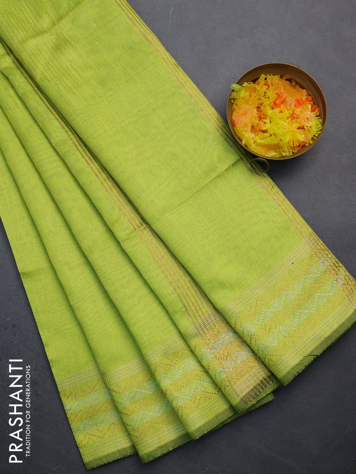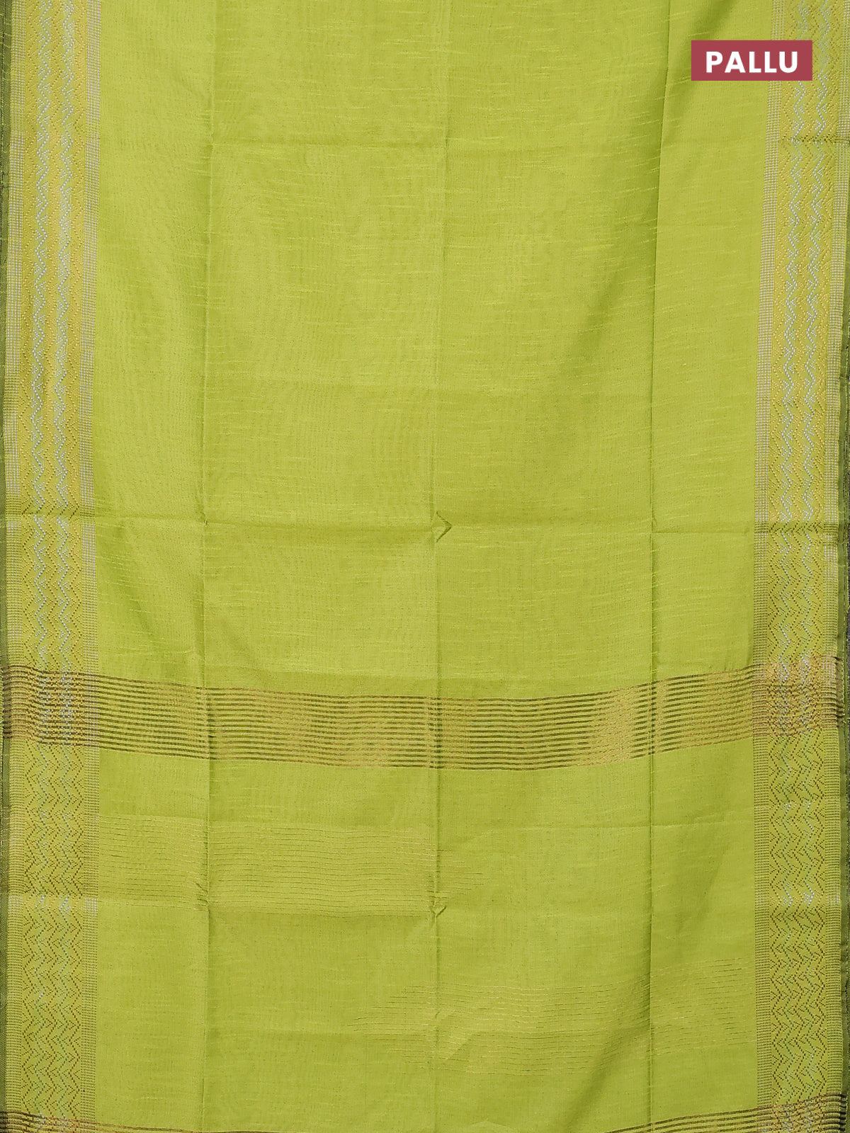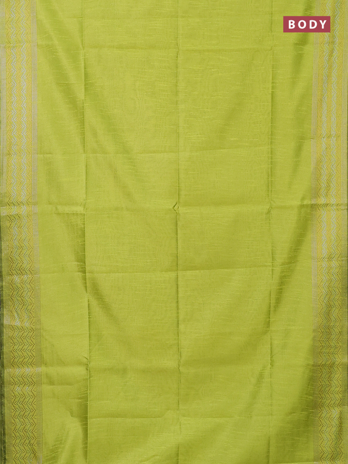 Semi dupion saree fluorescent green with plain body and silver & gold zari woven border