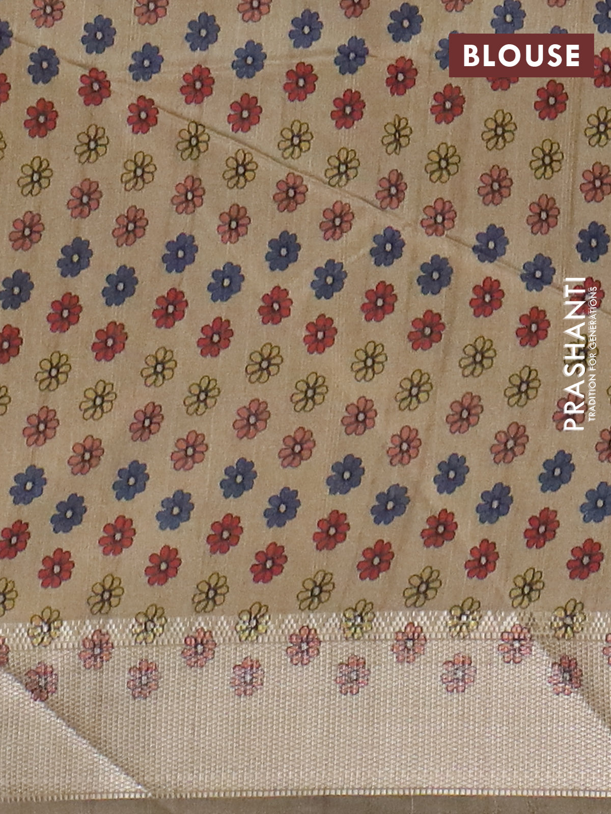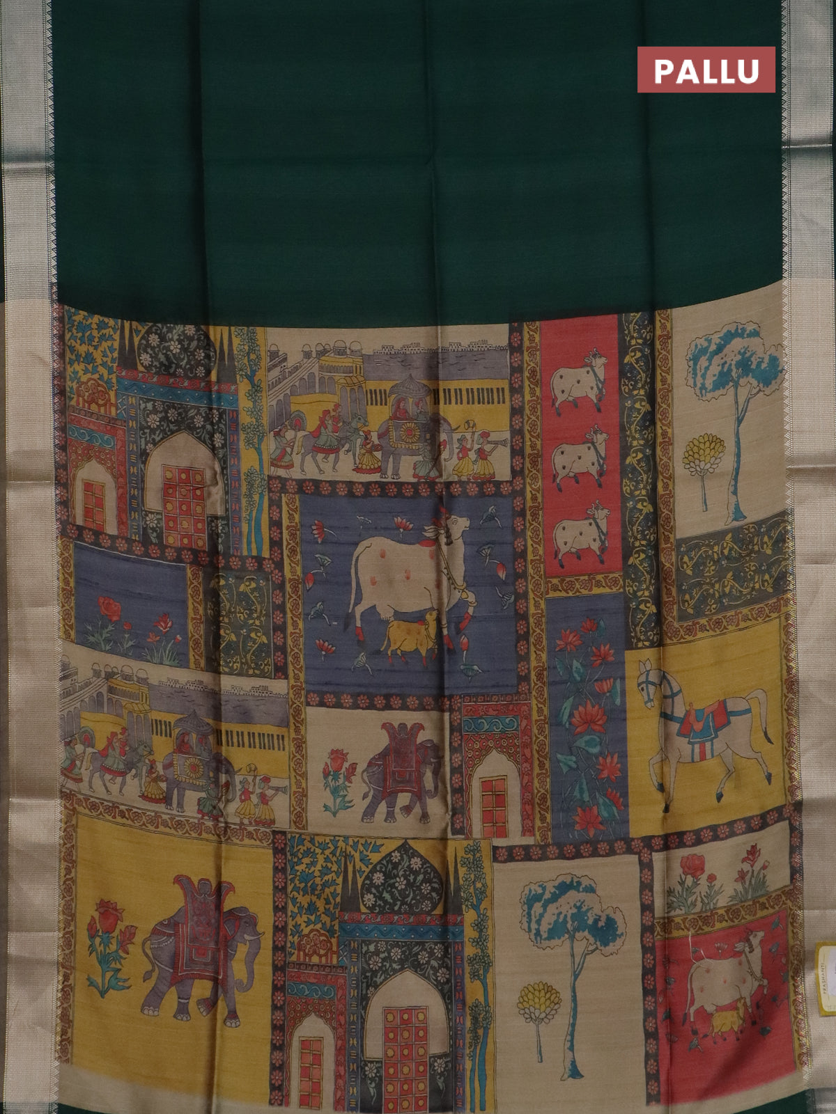 Semi dupion saree green and beige with plain body and kalamkari printed pallu