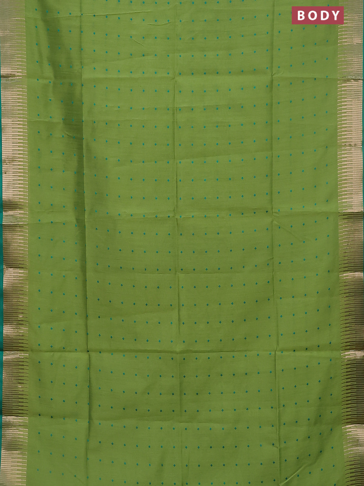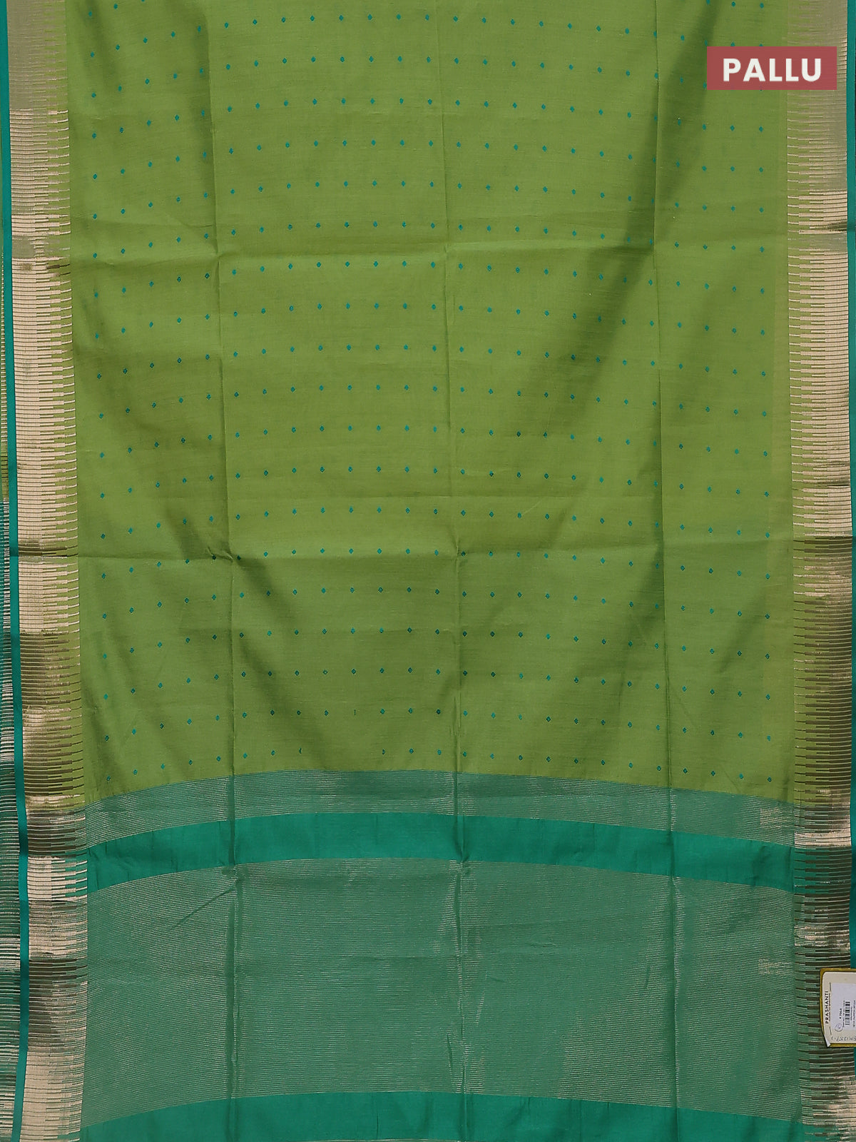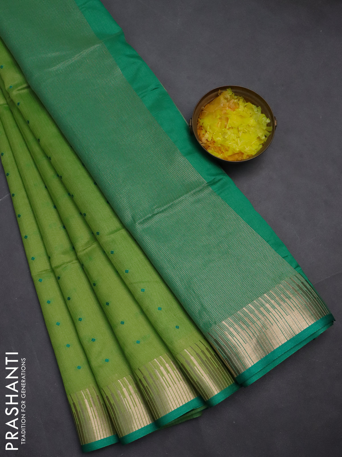 Semi dupion saree light green and green with allover thread woven buttas and temple design zari woven border